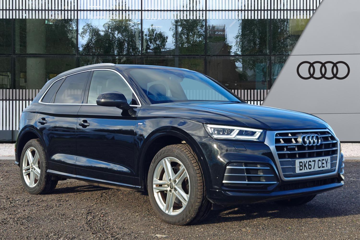 Walton on Thames1 Previous Owner, Franchise Approved, BK67CEY, Black, VAT M This vehicle will come with 12 Months RAC Warranty & Breakdown Cover. Please call for an appointment as not all vehicles are kept on site.Walton Audi is delighted to offer our Audi Q5 S line 2.0 TDI Quattro Stronic, finished in Mythos Black Metallic. Additional spec is Rear View Camera, Folding Mirrors, Hillhold Assist. ***************************************************************************We are conveniently located just next to the Walton Train station on Station Avenue, SAT NAV postcode KT12 1NR. Call us now on 01932 220 404 to reserve this car, ask for more details or request personalised video about this vehicle. Walton AUDI (KT12 1NR) WE ARE AN AUDI APPROVED RETAILER. All our approved vehicles will undergo 150point exacting checks with a full roadtest and a detailed report. All scheduled service and maintenance identified thats due within the next 6 months or 6,000 miles (whichever comes first) will be completed during preparation, We will also replace any tyre measuring below 3mm.***************************************************************************Other cars available throughout the Audi range include: S LINE, BLACK EDITION, ETRON, QUATTRO, EDITION 1, SPORTBACK, VORSPRUNG, RS, SQ. ALL SPECIFICATIONS ARE AVAILABLE & CAN INCLUDE; AUTOMATIC, PANORAMIC SUNROOF, PANORAMIC OPENING ROOF, LEATHER SEATS, HEATED SEATS, REAR CAMERA, 360 CAMERA, PARKING SYSTEM PLUS, APPLE CAR PLAY OR ANDROID AUTO, KEYLESS ENTRY.