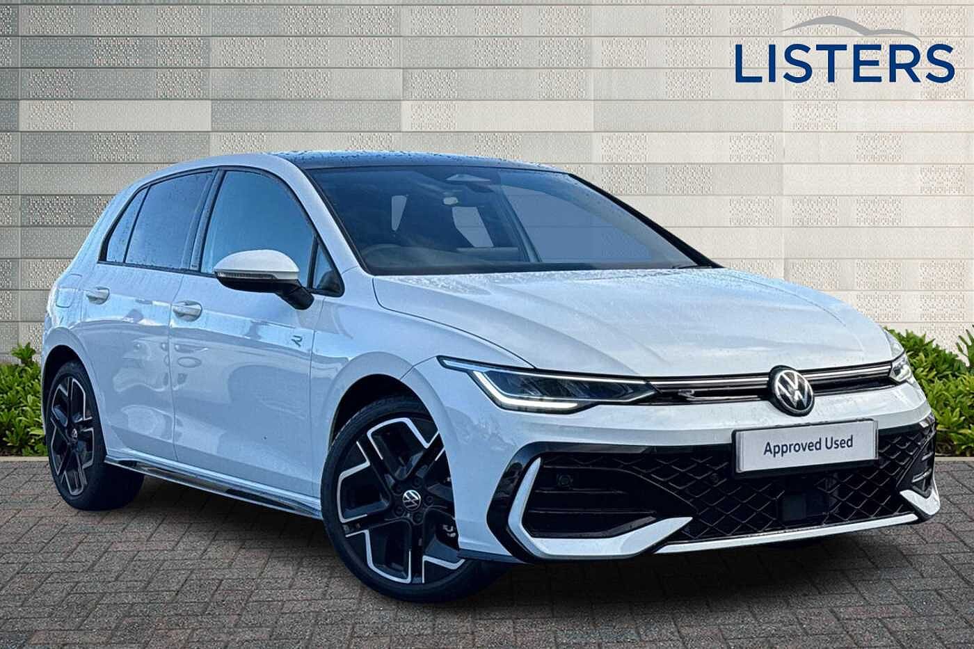 Ex-Demo, Insurance Group 22, 0 Previous Owners, Franchise Approved, Available from 03/03/2026. Volkswagen Golf Hatchback 1.5 eTSI 150 R-Line 5dr DSG in Pure White. Specification Includes Safety,Front and rear parking sensors,Interior Features,Leather wrapped multifunction sports heated steering wheel with touch control and paddle shift,Tilting and sliding panoramic sunroof with 2X front and 2X rear LED reading lights,Wheels,18in York alloy wheels with diamond turned surface,Packs,Winter package - Golf DSG Estate/Hatchback,Exterior Features,Front and rear electric windows,Heat insulating windshield made of laminated glass,Rear windscreen washer and wiper with interval delay,Body colored bumpers in R-Line style,Body colour door handles,Rear exhaust tailpipe,Rear side wing doors,3rd brake light,Automatic headlamp activation with Coming home and Leaving home feature,LED separate daytime running light,Rear fog light on one side and reversing lights on both sides,Welcome light with surround lighting,Safety,ABS,Autonomous emergency braking front assist with pedestrian and cyclist monitoring,Electronic parking brake with auto hold,ESC (Electronic Stability Control),Hill start assist,Rear disc brakes,Volkswagen roadside assistance,Activated carbon canister,Adaptive cruise control (ACC),Advanced driver attention and drowsiness monitor,Dynamic road sign display,Dynamic steering,Multifunction front facing camera for distance control,Oncoming vehicle braking when turning including swerve support,Speed limiter,Exterior mirrors convex on the left and aspherical on the right,Remote electrically foldable door mirrors- puddle lights and reverse activated passenger's door mirror,3 point height adj front seatbelts + pretensioners,3 rear three point seatbelts,Child locks on rear doors,Driver and front passenger airbag with front passenger airbag deactivation,Extended pedestrian protection measures,Two tone horn,Tyre pressure loss indicator,Interior Features,Front + rear black carpet mats,12V socket in front centre console,12V socket in luggage compartment,Black roof lining,Brushed stainless steel pedals,Chrome plated radiator grille inserts- air vent surrounds and light switch surrounds,Door insert- side trim panel and arm support in leatherette,Front centre armrest,Plastic gear knob,Rear cupholder and loadthough,Sardegna cloth upholstery with front and outer rear seats Art Velour inner sides of bolsters,Titanium black instrument panel,Ambient lighting with 30 colour including LED light unit in front footwell with selectable light