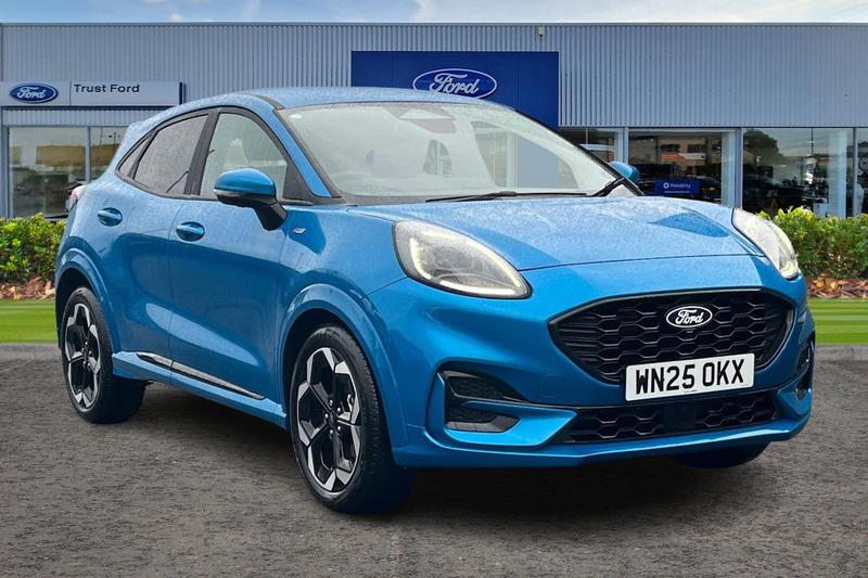 Insurance Group 13, Driver impairment monitor, Emergency call service, Ford easy fuel, Full digital 12.8 instrument cluster, Lane keeping aid with lane departure warning, Power assist steering, Selectable drive modes(Normal, Eco, Sport, Slippery and Trail), Speed sign recognition, Automatic headlights with rain sensing wipers and auto high beam, Front fog lamps, LED daytime running lights, LED rear lamps, LED third brake light, Power foldable heated door mirrors with puddle lamps and puma logo protection, Quickclear heated windscreen, Rear privacy glass, Rear side wing doors, Rear wiper, ST-Line X body styling kit, 3 seat bench in 2nd row, 4 way lumbar support for passenger seat, Centre console with armrest and stowage, Electronic automatic temperature control (EATC), Ford megabox extended bootspace, Front and rear head restraints, Front floor mats, Manual 4 way driver seat adjust with lumbar adjustment, Single front passenger seat, ST-Line X Premium synthetic leather upholstery, 3 rear seatbelts, Child safety lock, Electronic stability control (ESC) and hill start assist, Pre-collision assist with autonomous emergency braking, pedestrian/cyclist detection & post-collision braking, Tyre pressure monitoring system (TPMS)