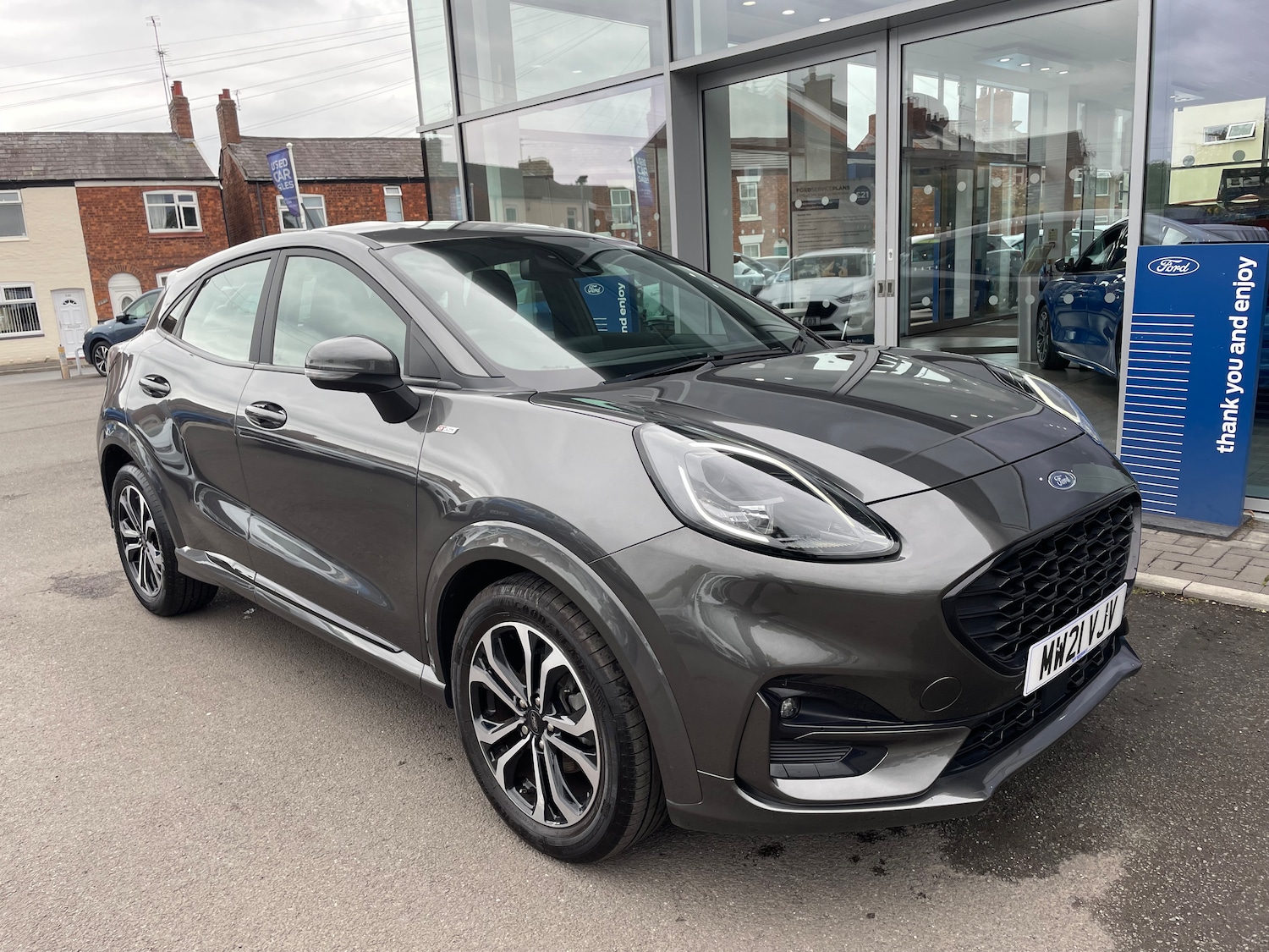 The ST-Line is a sporty and stylish version of the Ford Puma crossover SUV. As part of the ST-Line trim level, it combines a more dynamic exterior design with sporty interior touches to offer a spirited driving experience and a distinct aesthetic appeal. This includes unique front and rear bumpers, a honeycomb grille with a prominent ST-Line badge, and sleek LED headlights. The exterior sporty accents such as side skirts, larger alloy wheels with a unique design, and a rear spoiler that not only adds to the aesthetics but also contributes to aerodynamics. The ST-Line comes equipped with an advanced infotainment system, complete with a touchscreen display, smartphone integration, Apple CarPlay and Navigation. The Ford Puma ST-Line is an appealing choice for drivers who want the practicality of a crossover SUV combined with sporty design elements and an engaging driving experience.
