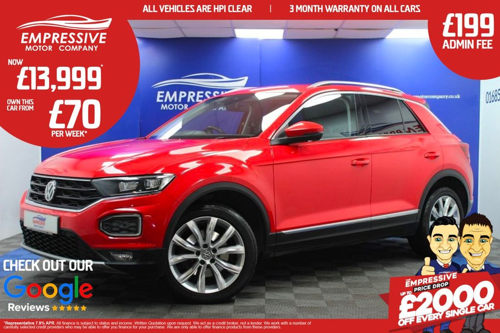 Merthyr TydfilInsurance Group 19, 2 Previous Owners, ****TERRIFIC T-ROC**** Just in! This Stunning 2019 VOLKSWAGEN T-ROC 2.0 TDI SEL SUV 5dr Diesel Manual 4Motion Euro 6 (s/s) (150 ps) Finished In Red! 59,876 miles - 1.0L petrol - 17" diamond cut wheels - Automatic headlights - Parking sensors - Touch media screen with sat nav - Bluetooth connectivity with apple car play - USB - Automatic 2 zone climate control - Start stop - Electric handbrake - Adaptive cruise control - Voice control - Speed limiter - Lane assist - Electric folding heated mirrors .12V Socket in Centre Console in Storage Area, 18in Alloy Wheels - Arlo Sterling Silver, 2x USB Connection - USB Charging Sockets, 4MOTION Active Control, ABS - Anti-Lock Braking System, Active Info Display, Adaptive Cruise Control, Airbags - Front Seat Side Impact, Alarm, Ambient Lighting in Front Footwell and Light Stripes Below Trim in Front Doors, Armrest - Front Centre, Automatic Dimming Interior Rear View Mirror, Automatic Hazard Lights Activation Under Emergency Braking, Automatic Leaving Home and Manual Coming Home Lighting Function, Black Grained Lower Door Protectors, Black Grained Wheel Arches, Body Coloured Bumpers with Silver Metallic Underbody Fascia, Body Coloured Door Mirrors with Integrated Indicators, Body-Coloured Door Handles, Car-Net App-Connect, Car-Net Guide and Inform (3 Year Subscription From New), Car-Net Security and Service including eCall, Caribou Grey Decorative Inserts in Dash and Door Panels, Chrome Effect Trapezoid Dummy Exhaust Tailpipe Surrounds - Left and Right, Chrome Trim on Radiator Grille - Upper and Lower, Climate Control - 2Zone Electronic Air Conditioning with Automatic Air Recirculation and Allergen Filter, Composition Media System, Cup Holders - Front x2, Curtain Airbag System, Discover Navigation Touch-Screen Navigation-Infotainment System with Car-Net Guide and Inform, Driver Alert System, Driver Profile Choices, Drivers and Front Passengers Airbags with Front Passenger Airbag Deactivation Switch, Drivers and Front Passengers Safety Optimised Head Restraints, Dusk Sensor, Electric Windows - Front and Rear, Electrically Foldable Door Mirrors, Electronic Engine Immobiliser, Electronic Parking Brake with Auto Hold Function, ESC - Electronic Stability Control - Includes EDL - Electronic Differential Lock and ASR - Traction Control - EDTC - Engine Drag Torque Control and Trailer Stabilisation Function, Footwell Illumination - Front, Front Assist - Radar Sensor Controlled Distance Monitoring System - City Emergency Braking System and Predictive Pedestrian Protection, Front Fog Lights with Static Cornering Function, Front Seat Back Storage Pockets, Front Sport Seats with Height Adjustment, Galvanised Body, Glovebox, Heated Rear Window, Height and Reach Adjustable Steering Wheel, Height-Adjustable Front Three-Point Seat Belts with Tensioners, High Level 3rd Brake Light, Instrument Lighting - White Adjustable Panel Illumination, Interior Lighting Delay, Isofix Child Seat Preparation - Easy-Fit - For 2 Outer Rear Seats,