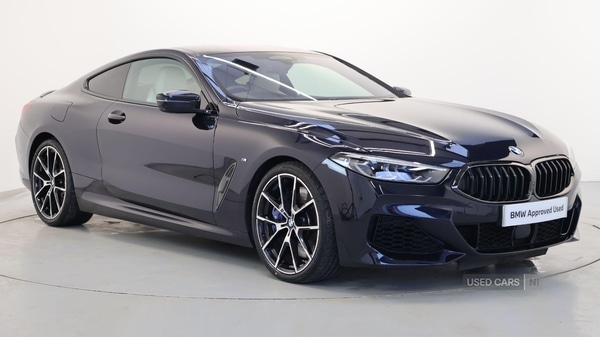 Coleraine1 Previous Owner, This 2021 BMW 8 Series 840i M Sport is a remarkable example, boasting exceptionally low mileage for its age, and is BMW manufacturer approved. This Euro 6 compliant model features a powerful 3.0 litre petrol engine and is presented in the desirable M Sport trim. It comes equipped with the Technology Plus Pack, which includes a 360 degree camera and a premium branded sound system, alongside the Visibility Pack featuring advanced Laser headlights. Further enhancing its appeal is the M Sport Pro Pack and the comprehensive Parking Assistant Plus system, offering front and rear cameras and sensors for effortless manoeuvring.The 840i M Sport offers a compelling blend of performance and practicality, with a highlight fuel economy of 34 mpg and a low CO2 emission rating. Its large boot space provides ample room for luggage, making it a versatile choice. The vehicle also benefits from a low insurance group, indicating that running costs are kept to a minimum. These highlights demonstrate how this BMW 8 Series stands out from other similar vehicles, offering a superior ownership experience. EU6 RDE II exhaust emissions standard, M Sport Brakes with Blue Calipers, M Sport Differential, Tyre Repair Kit, Alarm System, Comfort Access, Climate Comfort Windscreen, Front Electric Sport Seats, Stainless Steel Fabric Interior Trim, High-Beam Assistant, Active Guard, BMW TeleServices, BMW Emergency Call, BMW Online Services, Connected Package Pro (limited duration), Enhanced Bluetooth- wireless charging, Live Cockpit Professional, WiFi Hotspot, DAB Radio, M Sport Exterior Styling, High-gloss Shadowline Exterior Trim, Active Pedestrian Safety, Decoding additional functions, M Sport Package, 20'' 728 M Y-Spoke Bi-colour Alloy Wheels, Soft-close Doors, M Sport Seat Belts, Heat Comfort System, Sun Protection Glass, Ventilated Front Seats, Driving Assistant Professional, Laserlights, Parking Assistant Plus, Drive Recorder, Bowers & Wilkins Diamond Surround Sound, Indv. high-gloss shadowline- extended, M Sport Spoiler, Anthracite Alcantara Headlining, Comfort Plus Pack, Visibility Pack, Technology Plus Pack, M Sport Pro Pack. Black 4 seats. BMW Approved Used Car