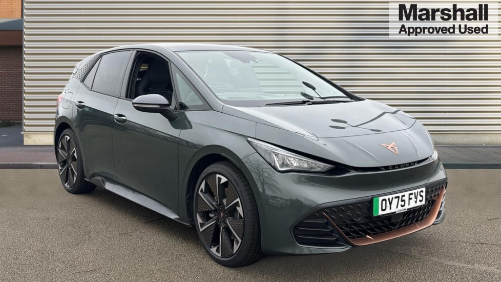 Insurance Group 34, 0 Previous Owners, ..5.3'' digital cockpit with 12.9'' central display infotainment system, Augmented reality head up display, Bluetooth, Dynamic steering, e-call service, Emergency steering support with turn assist, Forward collision warning with automatic braking, Lane assist, Right hand drive vehicle, Tailgate, Voice assistant, Wireless full link smartphone integration, 11 kW Onboard charger, 185kW DC charging capacity, Charging cable mode 3, type 2/3 32 A, Gear ratio 7915, Shock absorption in front, Sports rear shock absorption, 2x USB sockets in front, 2x USB sockets in rear, charge only, DAB (Digital Audio Broadcasting) and AM/FM radio, Sennheiser premium audio, Acoustic windshield, Auto dimming rear view mirror, Dark tinted rear windows, Electric adjustable/heated/folding door mirrors, Exterior VZ lettering, Full LED headlights, Grey exterior mirrors, Heat insulated glass, LED 3rd brake light, LED daytime running lights, LED rear lights, Rear side wing doors, Rear wiper, Transport protection film, Variable intermittent wiper, Welcome home function and adverse weather function, Windshield wiper with light/rain sensor, 3 seat bench in 2nd row, Aluminium pedals, CUP Bucket seats with power seat adjustment, lumbar support and memory feature, CUPRA emblem on steering wheel, Dual zone climatronic air conditioning, Electric auxiliary air heater, Heated front seats, Heated leather wrapped multi function steering wheel with satellite buttons, Integrated front head restraints, Interior smart light, ISOFIX points in outer rear seats with top tether anchorage points, Microsuede upholstery, Rear headrests, Single front passenger seat, Sunvisors with illuminated mirror, Tool kit with tirefit, Unsplit rear seat bench, split folding backrest, with centre armrest, Dynamic pack - Born, Safety and NCAP pack - Born, Tech M pack without Car 2X function - Born, 3 point seatbelts on all rear seats, Attention and drowsiness assist, Driver and front passenger airbags with front passenger airbag deactivation, side airbag in front with curtain airbag and front interaction airbag, Extended safety system with proactive passenger protection system, Tyre pressure monitoring system, Visual and acoustic seat belt reminder, Anti theft alarm system with interior monitoring in cab, backup horn and towing protection, Anti theft wheel bolts, Keyless go central locking system, Manual child locks, Preparation for alcohol interlock, Warranty - 5 years/90,000 miles, Tyre repair kit