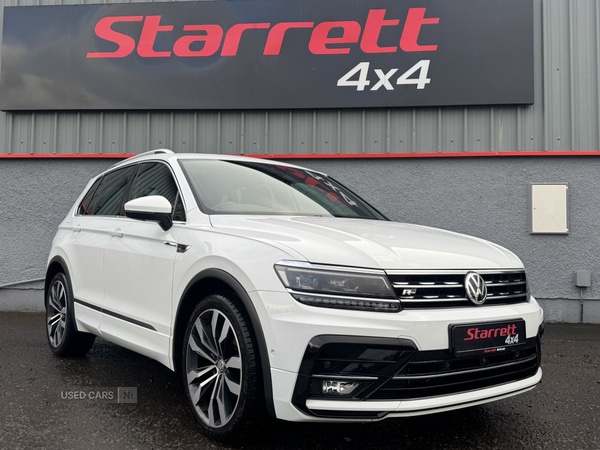 StrabaneInsurance Group 17, 1 Previous Owner, April 2019 Volkswagen Tiguan R-Line Tech 150 bhp 4motion DSG Auto in a totally un-marked signature Pure White non-metallic paintworkWith only 66,000 warranted miles backed up with a comprehensive service historyThis stunning car is in immaculate condition inside and out and will not be faulted, loaded with spec this is the ultimate family SUV with its award winning automatic gearbox and 4wd drive system means you have all round performance and convenience. Like with all our vehicles, this stunning car comes fully serviced-by ourselves and with 2 x keys and with the option of up to 24 month extended warranties are also available.Spec to include; R-Line 1/2 leather/alacantara interiorHeated seatsLED DRLSLED 'Mid' headlightsElectric boot lidProgressive steeringSports suspensionPanoramic roofLeather steering wheel Auto head lights & wipers Digital dual climate control Bluetooth handsfreeKeyless entryFront & Rear parking senosrs Tinted windows Digital dash20'' totally unmarked diamond cut alloysOptional alloy wheel upgrades available Please note; This stunning car will not be faulted in anyway, cared for exceptionally throughout and first to see will buy. LIKE WITH ALL OUR VEHICLES DELIVERY AVAILABLE TO ANYWHERE IN THE UK AND IRELAND