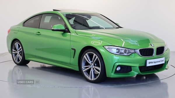 Coleraine1 Previous Owner, This 2014 BMW 4 Series 430d M Sport is a remarkable find, boasting an exceptionally low mileage of just 36,663 miles for its age. This Euro 6 compliant model features a powerful 3.0L diesel engine paired with a four wheel drive drivetrain, ensuring confident performance in all conditions. The M Sport trim enhances its dynamic appeal, while the Interior Comfort Package and Extended Storage offer a refined and practical cabin experience. Further enhancing its appeal are Xenon headlights for superior visibility and the convenient Concierge Service.The performance of this 430d M Sport is truly impressive, achieving 0-62mph in a swift 5.2 seconds, a testament to its potent engine and engineering. This acceleration figure indicates a superior driving experience compared to many similar vehicles. Furthermore, its low insurance group rating makes it an economical choice for many drivers. Practicality is also a strong suit, with generous boot space designed to accommodate your needs. Sport Automatic Transmission with Gearsh, Run-flat Tyres, Alarm System, Rear-view Mirror with Auto dimming, Electric Memory Seats, Sport seats, Heated front seats, Headlight Washer, Park Distance Control front and rear, Auto headlights with rain sensor, Xenon Headlights, Automatic Air Conditioning, Cruise Control, Additional Interior Lighting, BMW Emergency Call, BMW TeleServices, DAB Radio, M Sport Exterior Styling, High-gloss Shadowline Exterior Trim, Anthracite Headlining, M Sport Package, 19 inch M Double-spoke 442M alloy wheels, Brushed Aluminium Trim, Front armrest with sliding adjustment, High-gloss Black interior trim finisher, Electric Glass Sunroof, Sun Protection Glass, Ext. mirrors- folding with anti-dazzle, Extended storage, BMW Online Services, Real Time Traffic Information, Concierge Service, Remote Services, Enhanced Bluetooth with USB and Voice, Full Black Panel Display, BMW Navigation System Pro, Harman/Kardon Surround Sound Audio, Interior comfort package, Media package - Professional. Green 4 seats. BMW Approved Used Car