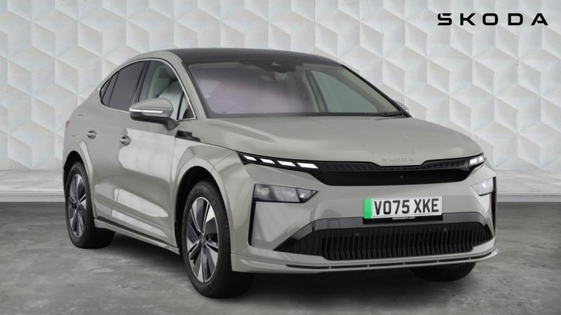 0 Previous Owners, Special solid paint, Transport package with variable boot floor - Enyaq, Winter pack - Enyaq, Special solid - Meteor grey, Fabric/artificial leather - Grey/black with grey stitching, Electric front and rear windows, Heat insulating darkened glass in side and rear windows, Heat insulating glass in windshield, Rain and light sensors, Rear wiper, Variable front intermittent wipers, Body colour door mirrors and handles, Body colour door sills, Dashboard and door moulding light in multiple colours, Panoramic glass roof, Radiator grille in matt black with chrome surround, Rear side wing doors, Safety reflectors on front and rear doors, Unique dark chrome side window surrounds, Dynamic headlight range control with cornering light function, Full LED Matrix beam headlights with variable light distribution, Integrated fog light with all-weather function, LED daytime running lights, LED rear lights with animated indicators, LED third brake light, Light assistant (coming and leaving home), ESC (incl. ABS+MSR+ASR+EDS+HBA+DSR+RBS+MKB), Front disc brakes, Rear drum brakes, Blind Spot Detection (BAS), Drive mode selector, Driver alert system, Electronic engine sound, Front and rear parking sensors, Front assist with assisted automatic braking to vehicles, pedestrians and cyclists, Power assist steering, Skoda Connect iV remote services with charging, air conditioning and smart schedules, Speed limiter, Auto dimming rear view mirror, Door mirror memory, Electric adjustable heated folding door