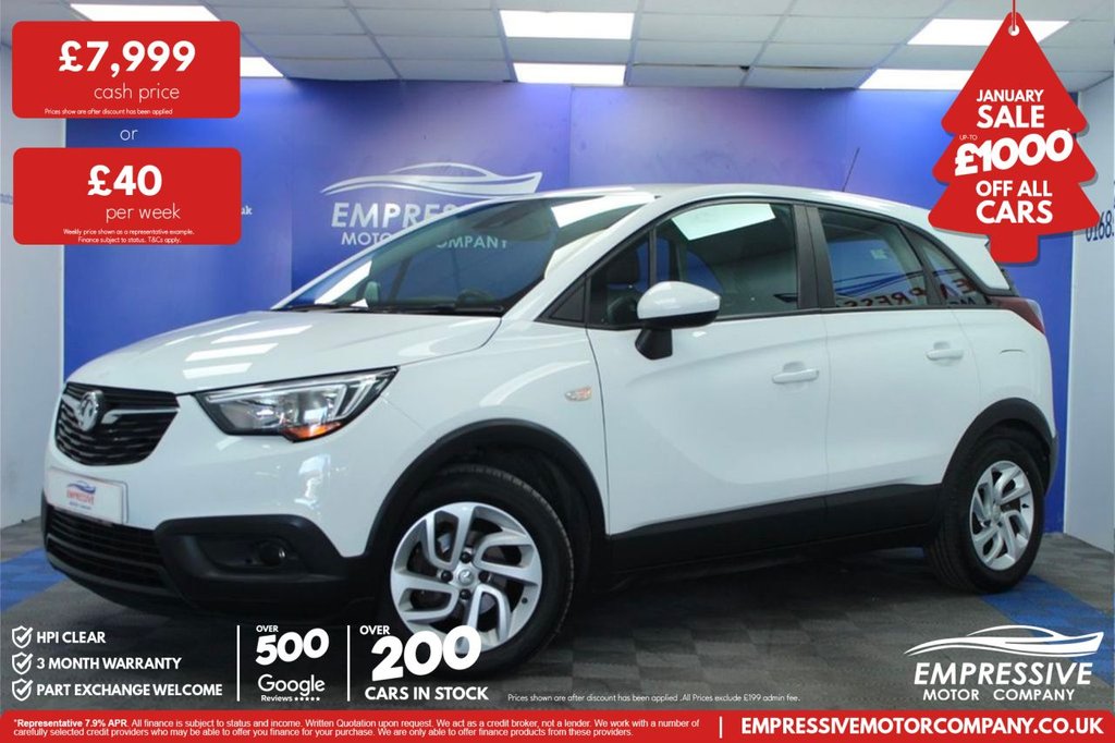 Merthyr TydfilInsurance Group 8, 2 Previous Owners, ****CRACKING CROSSLAND**** Just in! This Stunning 2019 VAUXHALL CROSSLAND X 1.2 SE SUV 5dr Petrol Manual Euro 6 (83 ps) Finished In White! 45,802 miles 1.2L petrol Insurance group 8E Up to 68 mpg Touch media screen Bluetooth connectivity USB Automatic 2 zone climate control Traction control Lane assist Voice control Cruise control Speed limiter Auto lights Auto wipers .12V Electrical Accessory Socket, 16in Alloy Wheels - Silver-Effect Four Twin-Spoke, ABS - Anti-Lock Braking System, Airbags - Front Seat Side-Impact, Anti-Submarining Ramps in Front Seats, Automatic Lighting Control, Automatically Dimming Anti-Dazzle Rear-View Mirror, Black Door Panels with Black Atlantis Cloth Inserts, Body Colour Roof and Door Mirrors, Body Coloured Door Handles, Central Facia Display, Child Proof Locks on Rear Doors, Chrome Effect Front Grille Bar, Chrome Effect Interior Door Handles, Collapsible Windscreen Wiper System, Comfort Front Seats, Cruise Control with Speed Limiter and Intelligent Speed Adaptation, CSC - Corner Stability Control, Deactivation Switch For Front Passengers Front and Side Impact Airbags, Deflation Detection System, Deformation Zones Front and Rear, Door-to-Door Illumination, Driver Information Display, Drivers and Front Passengers Airbags with Active-Vent Technology, Drivers and Front Passengers Illuminated Vanity Mirrors with Flip-Up Cover, Dual Seatbelt Pretensioners on Front Seats, EBD - Electronic Brakeforce Distribution, Electrically Operated Front and Rear Windows with Safety Autoreverse and One-Touch Facility, Electronic Climate Control including Air Conditioning, Electronically Protected Audio Equipment, Energy Absorbing Steering Column, Engine Deadlock Immobiliser, Engine Drag Torque Control, Four Adjustable Facia Vents, Front and Rear Passengers Assist Handles, Front Camera System, Front Door Pockets with 1.5-Litre Bottle Holder, Front Fog Lights, Fuel Gauge with Low Fuel Warning Light, Full Size Curtain Airbags for Driver - Front Passenger and Outer Rear Seat Passengers, Fully Carpeted Luggage Area, Glovebox with Lid, Halogen Headlights, Hazard Warning Lights, Heated Rear Screen with Timed Cut-Off, Heated Rear Window, Height-Adjustable and Removable Outer Rear Seat Head Restraints, Height-Adjustable Front Seat Head Restraints, High-Level LED Centre Rear Brake Light, Hill Start Assist, Hydraulic Brake Assist, Hydraulic Brake Boost, Illuminated Luggage Area, Inertia-Reel Lap and Diagonal Seatbelts, Infotainment Surround - Piano Black, Interior Courtesy Light Operated By Door Switches, Intermittent Rear Window Wipers with Washer, ISOFIX Child Seat Mountings Incorporating Top Tether Anchor Points Located on Outer Rear Seats, LED Daytime Running Lights, Light Gravel Facia and Door Panel Inserts, Lights On Audible Warning, Load Limiters on Front and Outer Rear Seatbelt Retractors, Locking Wheel Nuts, Luggage