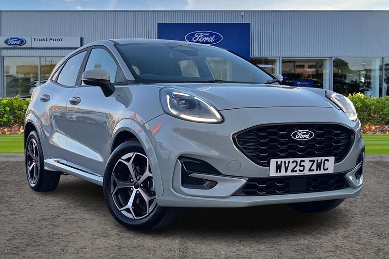BirminghamInsurance Group 13, Driver impairment monitor, Emergency call service, Ford easy fuel, Full digital 12.8 instrument cluster, Lane keeping aid with lane departure warning, Power assist steering, Selectable drive modes(Normal, Eco, Sport, Slippery and Trail), Speed sign recognition, Automatic headlights with rain sensing wipers and auto high beam, Front fog lamps, LED daytime running lights, LED rear lamps, LED third brake light, Power foldable heated door mirrors with puddle lamps and puma logo protection, Quickclear heated windscreen, Rear privacy glass, Rear side wing doors, Rear wiper, ST-Line body styling kit with unique grille, 3 seat bench in 2nd row, Centre console with armrest and stowage, Electronic automatic temperature control (EATC), Ford megabox extended bootspace, Front and rear head restraints, Front floor mats, Manual 4 way driver seat adjust with lumbar adjustment, Single front passenger seat, ST- Line cloth trim with red stitching, 3 rear seatbelts, Child safety lock, Electronic stability control (ESC) and hill start assist, Pre-collision assist with autonomous emergency braking, pedestrian/cyclist detection & post-collision braking, Tyre pressure monitoring system (TPMS)
