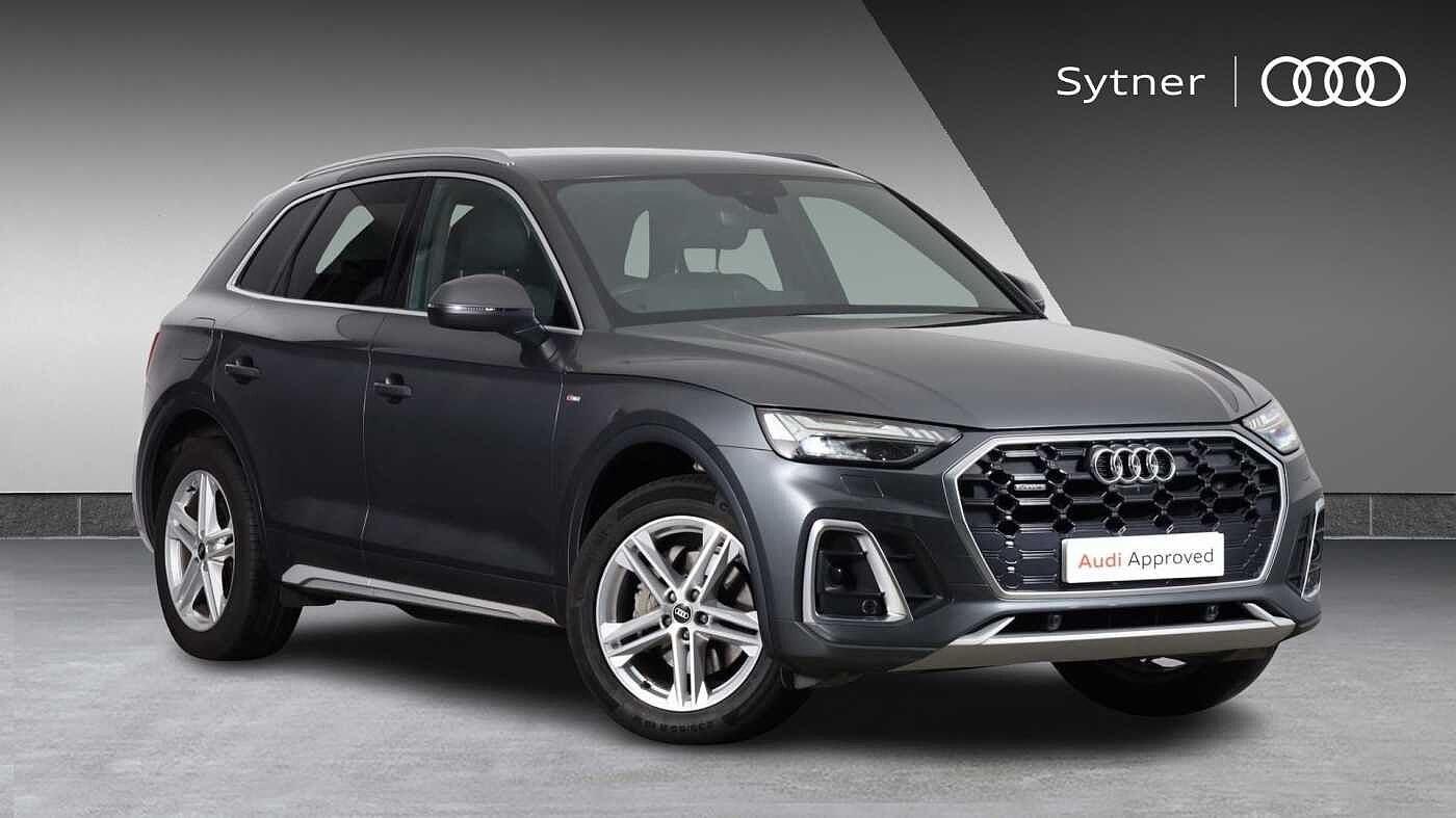Pride ParkInsurance Group 35, Matt brushed aluminium inlays, High gloss pack - Q5, LED interior light pack - Q5, Anti theft alarm, Anti-theft wheel bolts, Keyless Go access/ignition system, 2 USB charging ports, DAB Digital radio, 3 point seatbelts on all seats, 6 airbags - Driver, front passenger, curtain and side airbags, Electrically operated child locks on rear doors, Electromechanical parking brake, Electronic stabilisation control including ABS, ASR and EDL, Front passenger airbag deactivation, Hill descent control, Hill hold assist, Multi collision brake assist, Pop-up bonnet for pedestrian protection, Pre sense city, Seat belt force limiter, Seatbelt monitoring, Tyre pressure warning, Warning triangle and first aid kit, Acoustic windscreen, Aluminium roof rails, Audi matrix LED headlights with LED rear lights + dynamic front and rear indicators, Auto dimming rear view mirror, Automatic headlight adjustment, Automatic headlights and windscreen wipers, Body colour bumpers, Body colour door mirrors, Body colour rear diffuser with matt aluminium silver surrounds, Body colour underbody protection, Chrome plated exhaust trims, Door sills in Selenite silver, Electric adjustable/heated/folding door mirrors, Front air inlet surrounds in aluminium, Front and rear electric windows, Front radiator grille in honeycomb design, Headlight washers, Lower bumpers painted in contrast Manhattan grey, Rear chrome trim strip below lights, Rear privacy glass and rear side windows, Rear spoiler, Rear wiper, Roof bars, S Line badges on the front wings, S Line front and rear bumpers, S Line side skirts, 3 rear headrests, 40:20:40 split folding rear seat with rear centre armrest, Black cloth headlining, Contrast stitching on seats, steering wheel and gear lever gaiter, Deluxe 3 zone electronic climate control, Front centre armrest, Front/rear floor mats, Gear lever in black leather, Heated front seats, Height adjustable front head restraints, Height/reach adjustable steering column, Illuminated door sill trims with S logo, ISOFIX child seat mounting and top tether, Manual seat adjustment with 4-way electric lumbar support, Removable luggage compartment floor, Stainless steel pedals, Sunvisors with vanity mirrors, Tool kit, Trunk roller cover, Amazon alexa Integration, Audi connect safety and service (e-call), Audi drive select, Audi virtual cockpit plus with 12.3" screen and three different layout designs, Audi wireless smartphone interface, Automatic start-stop system with coasting functionality and