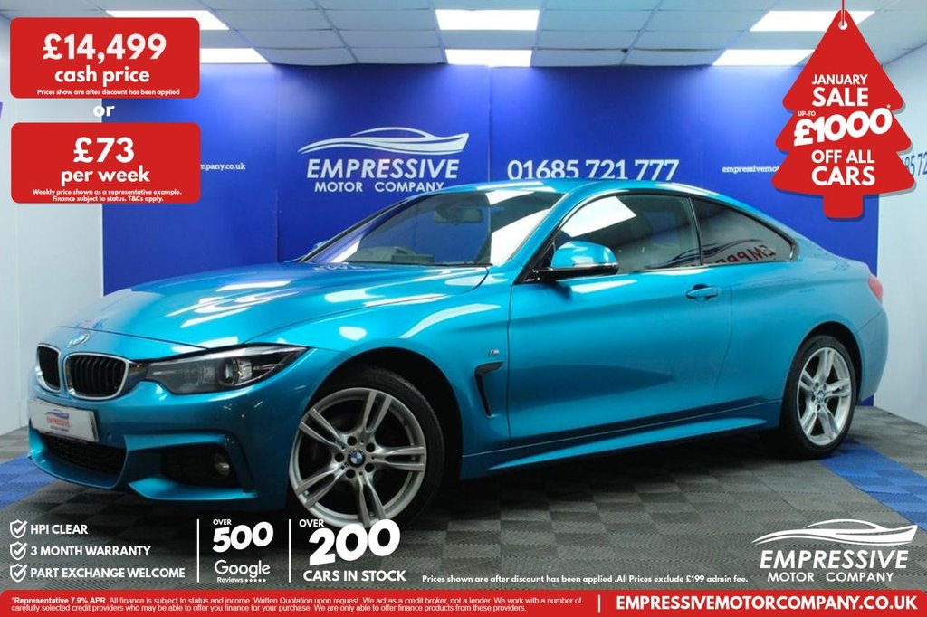 Insurance Group 31, 2 Previous Owners, ****MAGNIFICENT M SPORT**** Just in! This Stunning 2018 BMW 4 SERIES 2.0 420i M Sport Coupe 2dr Petrol Auto xDrive Euro 6 (s/s) (184 ps) Finished In Snapper Rocks Blue! 76,387 miles - 2.0L petrol - Automatic - 18" alloy wheels - Automatic LED headlights - Finished in snapper rocks blue - Full leather heated seats - Parking sensors - I drive infotainment system with sat nav - Bluetooth - USB - Automatic 2 zone climate control - Eco mode - Sport mode - Sport+ mode - Traction control - Voice control - Cruise control - Speed limiter - Paddle shift - Auto wipers .12V Power Socket in Front Centre Console and Passenger Footwell, 18in Alloy Wheels - M Double Spoke - 400M, Access to BMW Connected Plus (12 Month Subscription From New), Air Breather - Black High Gloss, Air Conditioning - Automatic with Two-Zone Control, Air Conditioning and Radio Control Panel in High Gloss Black, Airbags, Alarm System - Thatcham 1 with Remote Control and Engine Immobiliser, Ambient Lighting - Switchable BMW Classic Orange - Cold White - LED, Armrest - Front - Folding with Storage Compartment, Battery Safety Cut Off, Bluetooth Hands-Free Facility with USB Audio Interface and Audio Streaming, BMW ConnectedDrive Online Services, BMW Emergency Call, BMW Professional Radio with Single CD Player - with MP3 Playback Compatibility, BMW TeleServices, Bottle Holders Integrated into Door Trim Storage Compartments - Front - Up to 1 litre, Brake Pad Wear Indicator - Front and Rear, Bumper System Front and Rear - Replaceable Deformation Elements for Impacts Up to 9mph, Central Locking Switch - Doors - Fuel Filler Cap - Luggage Compartment, Centre Armrest For Rear Seats - Include Two Cup Holders, Centre Console - Panel Highlight in Chrome, Check Control Warning System for Monitoring of Lights and Door-Luggage Compartment Open Warning, Child Seat ISOFIX Attachment - Rear with Passenger Airbag Deactivation, Condition Based Service, Crash Sensor, Cruise Control with Brake Function, Cup Holders - Two in Front with Sliding Lid, DAB Digital Radio, Dakota Leather - Black with Black Interior, Direction Indicator - Side Repeaters - Integrated in Exterior Mirrors, Direction Indicator Lenses - LED, Door Sill Finishers - M Designation, DSC - Dynamic Stability Control Plus, Dynamic Brake Lights, Electric Windows - Front with Open-Close Fingertip Control - Anti-Trap Facility and Comfort Closing Function, EPS - Electric Power Steering, Exhaust Tailpipes - Dual Left - with Chrome Finisher, Extended Lighting, Exterior Mirrors - Heated - Electrically Adjustable, Exterior Parts in Body Colour, Exterior Trim - High-Gloss Shadowline, First Aid Kit and Warning Triangle, Floor Mats - Velour, Full Black Panel Display, Glove Compartment, Glove Compartment - Opener with Chrome Trim, Handbrake Lever - Gear Knob in Leather, Headlining - Anthracite, Heat Protection Glazing with Green Tint, High Level Third Brake Light, iDrive Controller - 8 Favourite Buttons, Instrument Cluster, Integrated Rear Seat Headrests - Two, Interior Lighting - Front Centre Over Interior Mirror with Soft-