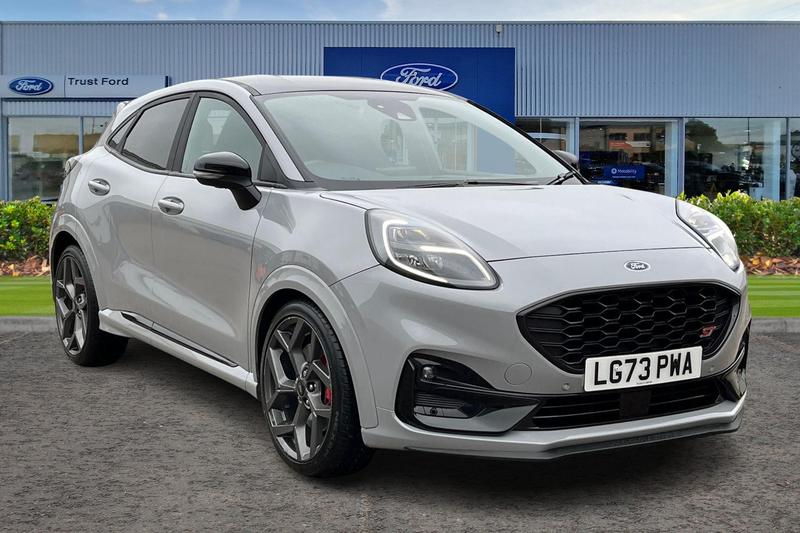 Insurance Group 21, Cruise control with Intelligent speed assist, Driver impairment monitor, Emergency call service, Ford easy fuel, Front and rear parking sensors, Full digital 12.3 instrument cluster, Lane keeping aid with lane departure warning, Power assist steering, Selectable drive modes (normal, sport, eco, track), Speed sign recognition, Automatic headlights with auto high beam, Automatic rain sensing wipers, Dual chrome exhaust, Fixed LED signature headlamps, Front fog lamps, LED daytime running lights, LED rear lamps, Power foldable heated door mirrors with puddle lamps and puma logo protection, Privacy glass to side rear windows and tailgate glass, Quickclear heated windscreen, Rear side wing doors, Rear wiper, ST scuff plates, Third brake light, Unique ST body styling kit including wing mirrors and Ford Performance embossed splitter, 3 seat bench in 2nd row, Alloy sports pedals, Centre console with armrest and stowage, Ford megabox extended bootspace, Ford Performance sensico partial premium leather upholstery with metal grey stitching, Front and rear floor mats, Front and rear head restraints, Manual 6 way driver seat adjust with lumbar adjustment, Manual 6 way passenger seat with lumbar seat adjustment, Single front passenger seat, ST flat bottomed steering wheel with metal grey stitching, ST logo projection, Unique ST gear shift knob, Wireless charging pad with electronic air temperature control (EATC), 3 rear seatbelts, Child safety lock, Electronic stability control (ESC) and