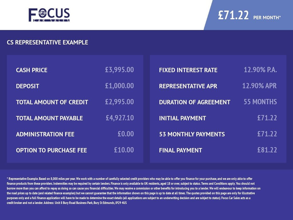 If your borrow amount is £6,000 with a deposit of £1,000, a selected term of 48 months, at a representative APR of 17.8%, you would pay £171.56 per month. Total charge for credit will be £2,234.88 and total amount payable is £9,234.88. CarMoney Limited can introduce you to a limited number of finance providers based on your credit rating and CarMoney will receive a commission for such introductions that can either be a % of the amount borrowed or a flat fee. This does not influence the interest rate you’re offered in any way. CarMoney is a broker not a lender.