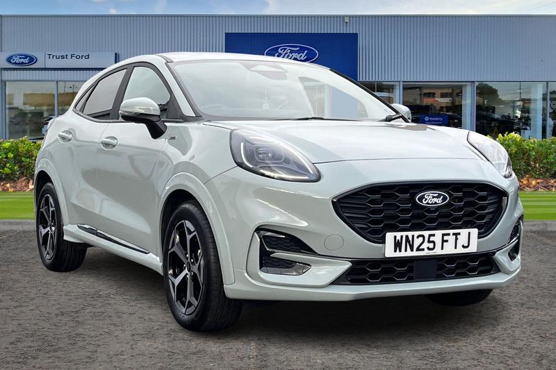 Driver impairment monitor, Emergency call service, Ford easy fuel, Full digital 12.8 instrument cluster, Lane keeping aid with lane departure warning, Power assist steering, Selectable drive modes(Normal, Eco, Sport, Slippery and Trail), Speed sign recognition, Automatic headlights with rain sensing wipers and auto high beam, Front fog lamps, LED daytime running lights, LED rear lamps, LED third brake light, Power foldable heated door mirrors with puddle lamps and puma logo protection, Quickclear heated windscreen, Rear privacy glass, Rear side wing doors, Rear wiper, ST-Line body styling kit with unique grille, 3 seat bench in 2nd row, Centre console with armrest and stowage, Electronic automatic temperature control (EATC), Ford megabox extended bootspace, Front and rear head restraints, Front floor mats, Manual 4 way driver seat adjust with lumbar adjustment, Single front passenger seat, ST- Line cloth trim with red stitching, 3 rear seatbelts, Child safety lock, Electronic stability control (ESC) and hill start assist, Pre-collision assist with autonomous emergency braking, pedestrian/cyclist detection & post-collision braking, Tyre pressure monitoring system (TPMS)