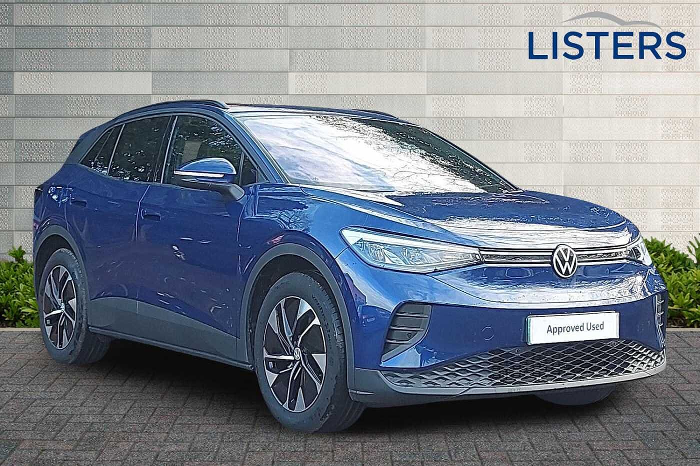 CoventryEx-Demo, Insurance Group 23, 0 Previous Owners, Franchise Approved, Available from 28/02/2026. Volkswagen ID.4 Estate 125kW Match Pure 52kWh 5dr Auto (19'' Alloys) in Blue Dusk Metallic. Specification Includes Exterior Features,Metallic paint,Safety,Rear view camera,Paint - Metallic,Metallic - Blue Dusk,Exterior Features,Climate windscreen assists defrosting and prevents fogging,Front and rear electric windows,Heat insulating darkened glass in side and rear windows,Heated windscreen washer jets,Rain sensor,Rear tinted glass from B-pillar backwards approx 65% tinted,Rear windscreen washer and wiper with interval delay,Variable front intermittent wipers,Black roof rails,Body colour door handles,Body coloured bumpers,Rear side wing doors,Roof trim strip in matte black,Ambient lighting- exterior illuminated styling elements in door handle recesses,Daytime running lights,LED Headlights,LED rear combination lamp,Third brake light,Welcome light,Safety,Anti-lock braking system (ABS),Autonomous emergency braking front assist with pedestrian and cyclist monitoring,Drum brakes in rear,Electronic parking brake with auto hold,Electronic Stability Programme (ESP),Front disc brakes,Traction control,Adaptive cruise control,Advanced driver attention and drowsiness monitor,Driving profile selection,Dynamic road sign display,Lane change system side assist and rear traffic alert,Oncoming vehicle braking when turning including swerve support,Park assistance plus with front and rear parking sensors,Power assisted speed sensitive steering,Automatic dimming interior rear view mirror,Electrically folding- adjustable and heated door mirrors,Exterior mirrors convex on the left and aspherical on the right,Gloss black door mirrors with integrated indicators,3 Point seat belts in front with pretensioners,3x3 point rear seat belts,Child safety lock,Driver and front passenger airbag with front passenger airbag deactivation,First aid kit with warning triangle and safety vest,Front curtain and side airbags with center airbag,Proactive passenger protection system in combination with front assist,Seat belt reminder (Japan design),Two tone horn,Tyre pressure loss indicator,Interior Features,Front + rear carpet mats,Air care climatronic 2 zone air conditioning system,Electric auxiliary air heater,2 USB-C ports in the front- 2 USB-C charging sockets on the centre console in rear- charging capacity up to 45 W,Armrests for both front seats,Art Velours microfleece cloth upholstery,Backrest with ID perforation,Black steering wheel,Central control unit in