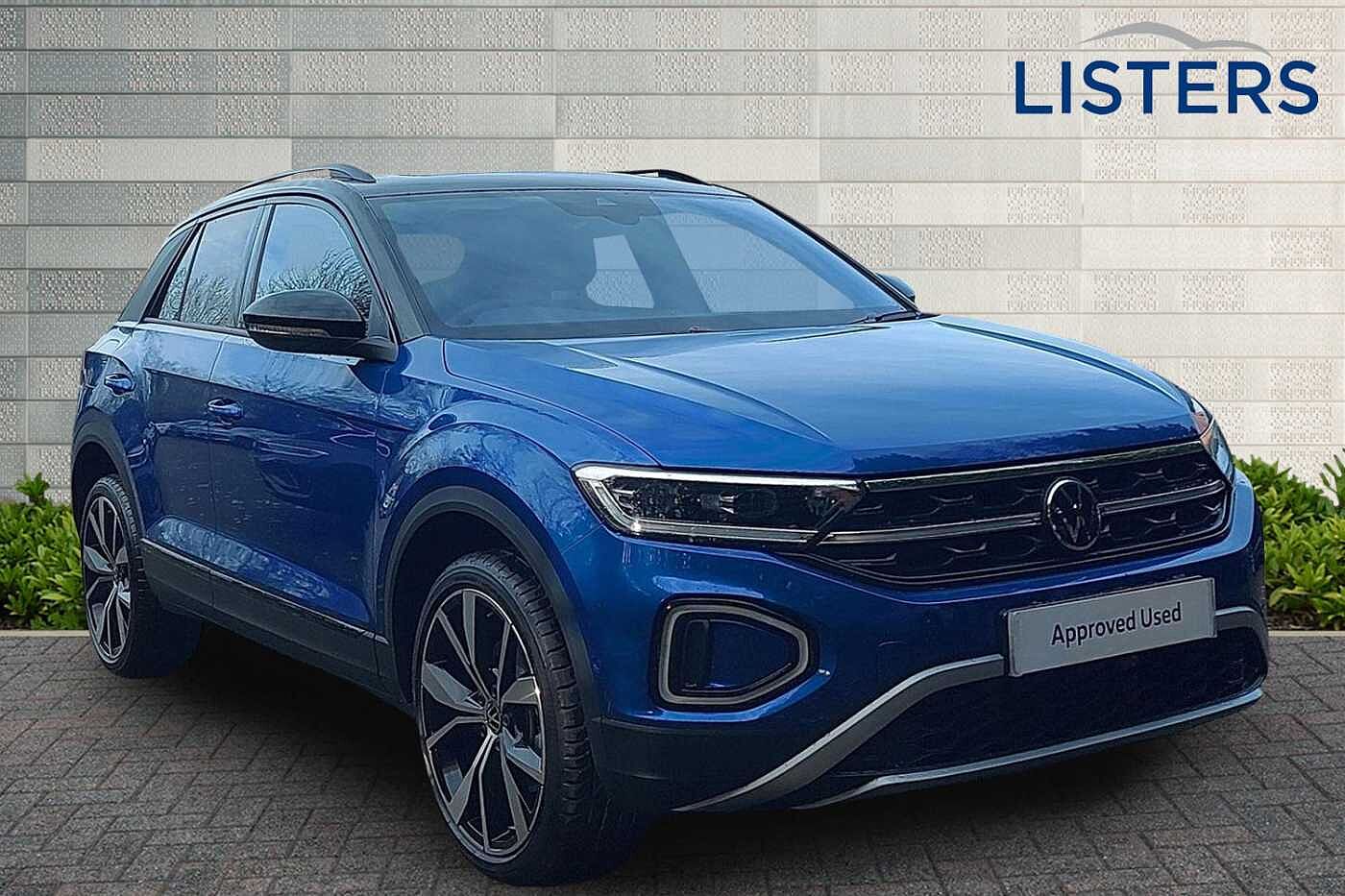 CoventryEx-Demo, Insurance Group 19, 0 Previous Owners, Franchise Approved, Available from 26/02/2026. Volkswagen T-Roc Hatchback 1.0 TSI 115 Style Design 5dr in Ravenna Blue Metallic Black. Specification Includes Exterior Features,Two tone metallic paint,Interior Features,Artvelours cloth upholstery,Packs,Ergoactive seat/ ergo active pack 1 - T-Roc,Wheels,19in Misano alloy wheels with low rolling resistance and anti theft wheel bolts,Paint - Metallic,Metallic - Ravenna blue with black roof,Exterior Features,Adhesive film in carbon look on the C-pillars,Front windscreen wiper with intermittent wipe and 4 position delay,Heated rear window,Power windows with comfort operation and circuit breaker,Privacy glass for rear side windows and rear window,Rain sensor,Rear wash/wipe with intermittent wipe setting,Front shock absorption,Rear shock absorption chassis with increased ride height,Black roof rails,Body colour sports bumpers with silver metallic underbody fascia,Body coloured exterior mirror housings and door handles,Extended roof spoiler,External USB type C socket and charging sockets,Illuminated front grille,Rear exhaust tailpipe,Rear side wing doors,Tilting and sliding panoramic sunroof with rear panoramic sunroof,Advanced dynamic light assist for LED matrix headlights,Automatic hazard lights activation under emergency braking,Dynamic cornering light,Dynamic headlight range control with self adjusting whilst driving,Exterior ambient lighting,IQ LED matrix headlights,LED 3rd brake light,LED rear number plate lights,LED rear tail lights with dynamic turn signal,LED separate daytime running light,Light mode for poor weather- rain- fog or snow,Rear fog light on one side and reversing lights on both sides,Safety,ABS,City emergency braking and pedestrian monitoring,Electronic parking brake,Electronic Stability Control (ESC) inc EDL (Electronic Differential Lock) and ASR (Traction Control),Front disc brakes,Rear disc brakes,Volkswagen roadside assistance,Advanced driver attention and drowsiness monitor,Dynamic road sign display,Lane keeping system Lane Assist,Modified key software - reduce switch off time for key status change to Long no motion,Park assist including front and rear parking sensors,Power assisted speed sensitive steering,Rear view camera,Auto dimming interior rear view mirror,Electrically adjustable and heated door mirrors,Exterior mirrors aspherical on driver side- convex on front passenger side,Remote electrically foldable door mirrors- puddle lights and reverse activated passenger's door mirror,3 point height adj