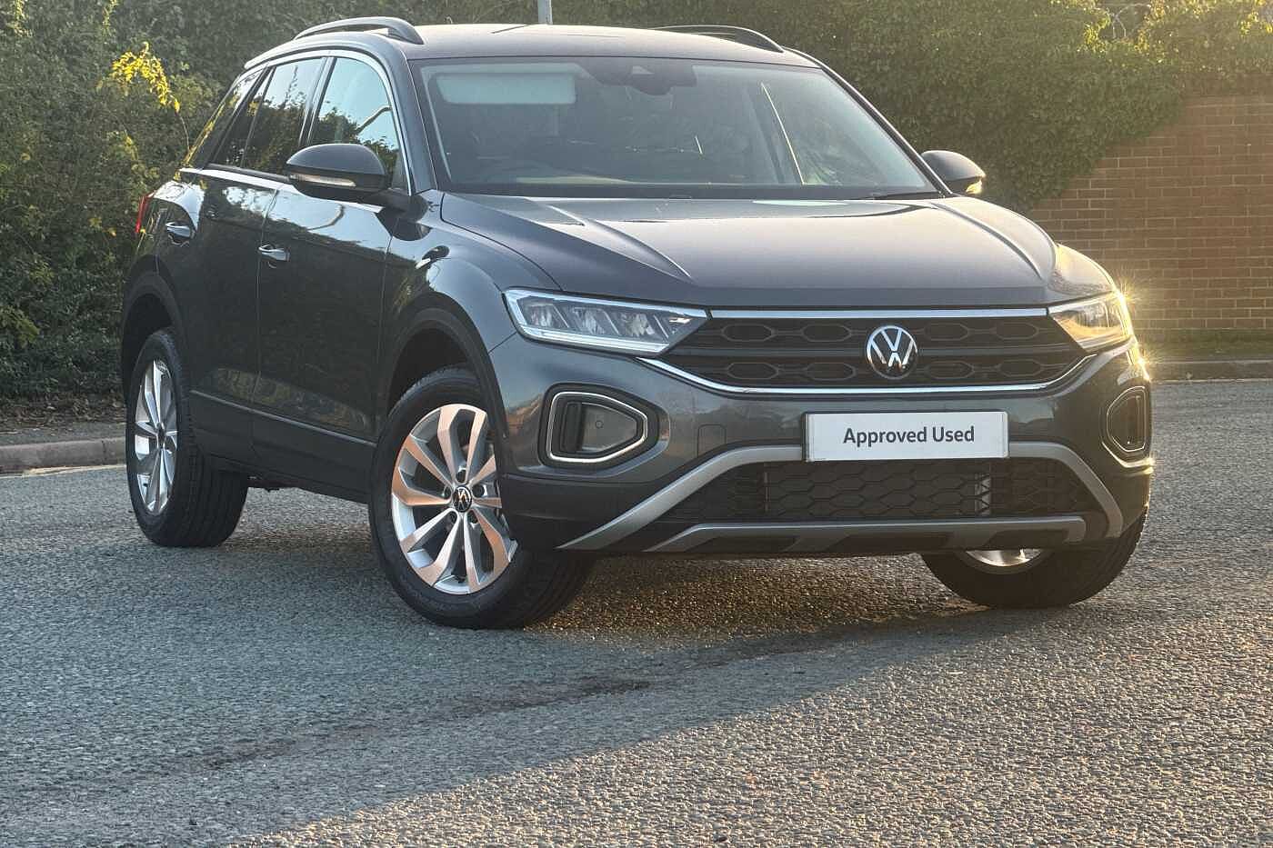 Ex-Demo, 0 Previous Owners, Franchise Approved, Available from 31/01/2026. Volkswagen T-Roc Hatchback 1.5 TSI Match 5dr DSG in Indium Grey. Specification Includes Interior Features,Heated leather wrapped multi function steering wheel with tiptronic,Paint - Metallic,Metallic - Indium grey,Trim - Cloth,Cloth - Titanium Black - Ceramique,Exterior Features,Front windscreen wiper with intermittent wipe and 4 position delay,Heated rear window,Power windows with comfort operation and circuit breaker,Privacy glass for rear side windows and rear window,Rain sensor,Rear wash/wipe with intermittent wipe setting,Front shock absorption,Rear shock absorption chassis with increased ride height,Black roof rails,Body coloured bumpers and radiator grille with chrome trim and front fog lamps with chrome bezel,Body coloured exterior mirror housings and door handles,Extended roof spoiler,External USB type C socket and charging sockets,Rear exhaust tailpipe,Rear side wing doors,Automatic hazard lights activation under emergency braking,Automatic headlight control with LED separate daytime running lights with coming/leaving home function,LED 3rd brake light,LED rear combination lamps,LED rear number plate lights,Rear fog light on one side and reversing lights on both sides,Safety,ABS,City emergency braking and pedestrian monitoring,Electronic parking brake,Electronic Stability Control (ESC) inc EDL (Electronic Differential Lock) and ASR (Traction Control),Front disc brakes,Hill start assist,Rear disc brakes,Volkswagen roadside assistance,Advanced driver attention and drowsiness monitor,Dynamic road sign display,Lane keeping system Lane Assist,Modified key software - reduce switch off time for key status change to Long no motion,Park assist including front and rear parking sensors,Power assisted speed sensitive steering,Rear view camera,Auto dimming interior rear view mirror,Electrically adjustable and heated door mirrors,Exterior mirrors aspherical on driver side- convex on front passenger side,Remote electrically foldable door mirrors- puddle lights and reverse activated passenger's door mirror,3 point height adj front seatbelts + pretensioners,3 point seatbelts in outer rear with ECE label,Child locks on rear doors,Driver and front passenger airbag with front passenger airbag deactivation,Driver and front passenger safety-optimised head restraints,Drivers seatbelt reminder,Front and rear passengers curtain airbag system including front side airbags,Predictive pedestrian protection,Two tone horn,Tyre pressure loss