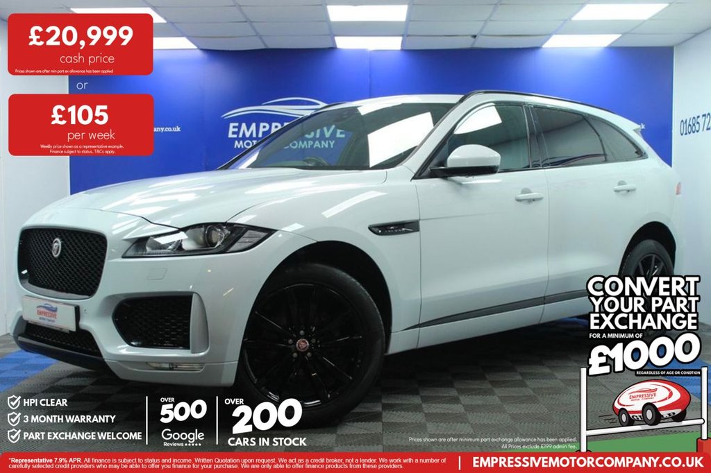 Merthyr TydfilInsurance Group 29, 2 Previous Owners, ****FABULOUS FPACE**** Just in! This Stunning 2020 JAGUAR FPACE 2.0 D180 Chequered Flag SUV 5dr Diesel Auto AWD Euro 6 (s/s) (180 ps) Finished In White! 66,102 miles 2.0L diesel Automatic 4 wheel drive 20" gloss black wheels Automatic LED headlights Powered tailgate Reverse camera Parking sensors Panoramic sun roof Full leather electric heated seats Heated windscreen Heated steering wheel Virtual cockpit Meridian sound system Touch media screen with sat nav Bluetooth with apple car play USB Automatic 2 zone climate control Start stop Traction control All terrain progress control sport mode Electric handbrake Voice control Cruise control Speed limiter Paddle shift Auto wipers Lane assist Ambient lighting Electric folding mirrors.10Way Electric Front Seats, 10in Touch Pro, 2Zone Climate Control, 20d AWD Badge, 20in Alloy Wheels 5 SplitSpoke Style 5031 with Gloss Black Finish, 3Flash Lane Change Indicators, 325mm Front Brakes, 402040 Split Fold Rear Seat, ABS Antilocking Braking System, Airbags Front Side, Airbags Full Length Side Window Curtain, AMFM Radio, Ambient Interior Lighting, Android Auto, Apple CarPlay, Approach Illumination, ASPC All Surface Progress Control, AutoDimming Interior Rear View Mirror, Bluetooth Connectivity, Bluetooth Streaming, Body Coloured Door Mirror Caps, BodyColoured Door Claddings with Gloss Black Finishers, Brake Pad Wear Indicator, Bright Metal Pedals, CDDVD Player, Centre Console Side Stowage, Centre Console Storage Surround Finishers Satin Chrome, Centre Console with Armrest, Connect Pro, Cruise Control with Speed Limiter, Digital Audio Broadcast DAB Radio, Door Trim Luxtec, Driver Condition Monitor, Dynamic Stability Control DSC, Dynamic Volume Control, EBA Emergency Brake Assist, Ebony Suedecloth Headlining, ECO Driving Style Assistant, Electric Windows Front and Rear with OneTouch OpenClose and AntiTrap, Electrically Adjustable Heated Door Mirrors, Emergency Braking, EPAS Electric Power Assisted Steering, EPB Electronic Parking Brake, FPACE Badge, Fixed Panoramic Roof, Front Airbags with Passenger Seat Occupant Detector, Front and Rear Parking Aid, Front Fog Lights, Front Headrests, Front Windscreen with Nonacoustic Layer, Gloss Black Grille with Gloss Black Surround, Gloss Black Roof Rails, Gloss Black Side Vents with Chequered Flag Badge, Gloss Black Side Window Surround, Glovebox Finisher with Jaguar Script, Green Tinted Glass, Headlight Power Wash, Heated Front Seats, Heated Front Windscreen, Heated Rear Window, Heated Steering Wheel, Hill Launch Assist, Hook in Loadspace, InControl Apps, Interactive Driver Display, Interior Front Door Handles with Separate Locking Switches, ISOFIX Rear, Jaguar Script and Leaper, Jaguar Tyre Repair System, JaguarDrive Control, Lane Keep Assist, LED Tail Lights, Lockable Glovebox, Luggage Tie Downs in Loadspace, Luxtec Wrapped Instrument Panel Topper with Wrapped Binnacle, Manually Adjustable Steering Column, Meridian Sound System 380W, Meshed Aluminium Trim Finisher, Metal Loadspace Scuff Plate, Metal Treadplates with Chequered Flag Branding, Navigation Pro, No Loadspace Storage Rails, Open Differential with Torque Vectoring by Braking, Outside Temperature Ga