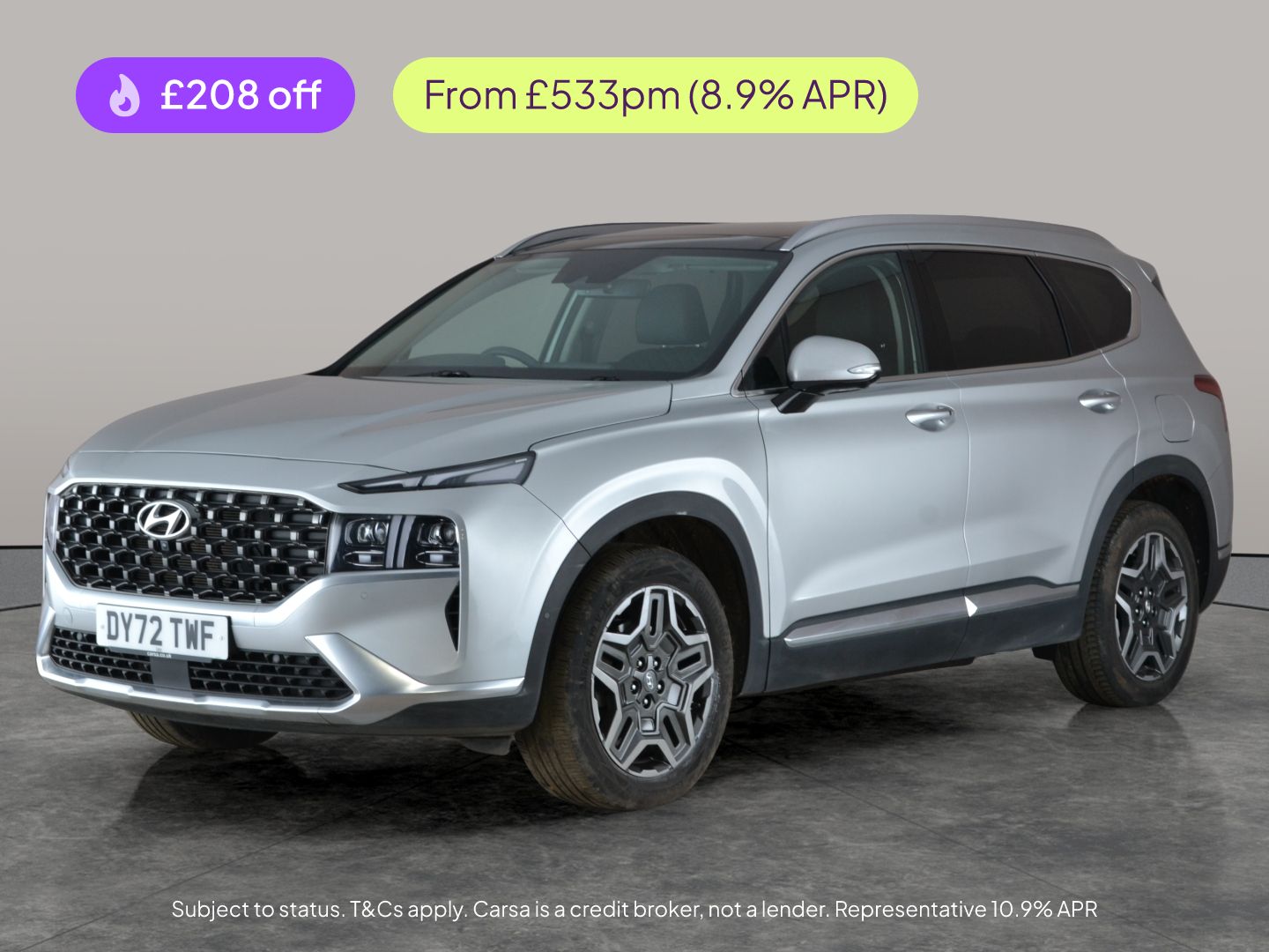 0 Previous Owners, Experience the Hyundai Santa Fe SUV in stunning silver, packed with luxury extras. Enjoy panoramic roof views, a high-tech head-up display, and sunroof. Stay connected with Apple CarPlay and navigate with ease using built-in sat nav. Manoeuvre confidently thanks to surround view and a reversing camera. Relax in premium leather seats with both heated seats and a heated steering wheel. Safety shines with LED headlights, blind spot assist, and lane departure warning, while keyless entry makes every journey seamless. 2 services recorded, last serviced on 20/05/2025 at 16,609 miles. MOT to 06/01/2027. Visit our website for service history, online valuation, full vehicle specification plus multiple images. This vehicle is VAT qualifying. Any feature/option specified here is from 3rd party data. We cannot guarantee the accuracy of any specification supplied by a 3rd party. We recommend that you physically check the specification of the vehicle on site prior to purchase. This information does not form part of the buying contract. Terms & Conditions apply. We have over 2,000 cars available from our 10 national branches, check our website to see all our stock. Our Trustpilot rating is 4.4/5 with over 9,000 reviews.