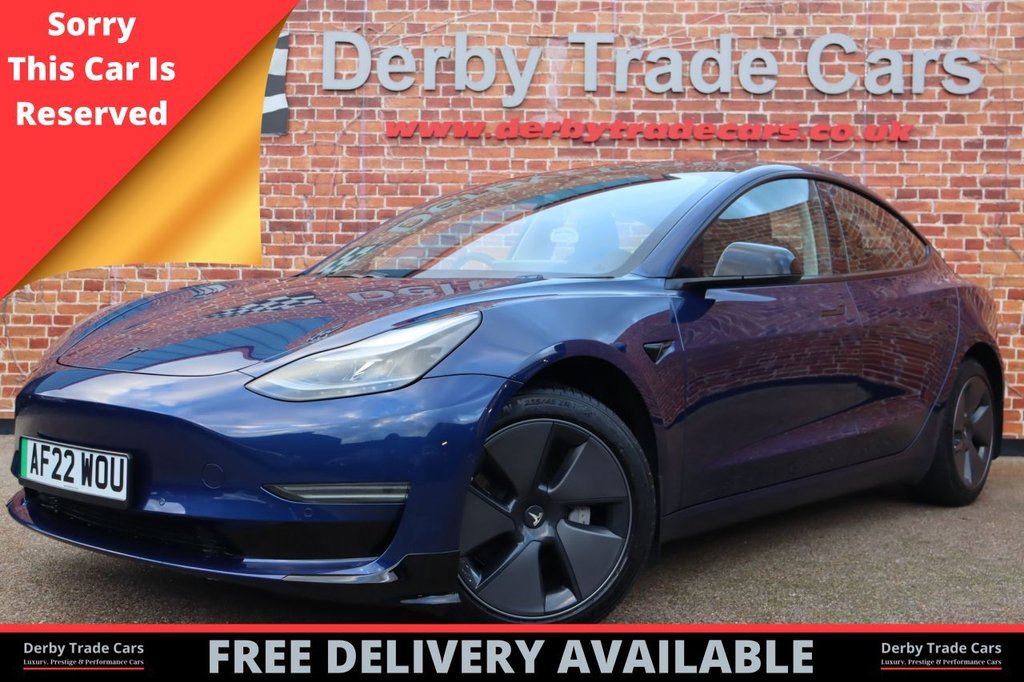 DerbyInsurance Group 48, 1 Previous Owner, Delighted To Present This 2022 Tesla Model 3 Standard Range Plus. A Perfect Blend Of Cutting-Edge Technology, Smooth Electric Performance, And Modern Styling—This Is The Ideal Premium EV For Daily Commuting Or Long-Distance Travel. Finished In Deep Blue With Some Great Specification Listed Below: EXTERIOR SPECIFICATION: - Front And Rear Parking Sensors - Full Glass Panoramic Sunroof - Automatic Headlights - LED Daytime Running Lights - Automatic Folding wing Mirrors - 360 Camera INTERIOR SPECIFICATION: - 15″ Central Touchscreen For Infotainment/Nav/Controls. - Full Touch Screen Sat Nav - Full Black Leather Seats - Heated Seats - Electric Memory Seats - DAB Digital Radio - Bluetooth Hands-free Connection - Bluetooth Audio Streaming - Climate Control/Air Conditioning - Carbon Style Dash Inlays MOT Until 9th December 2026 With NO Advisories. Tyres In Great Condition, Fronts With 5mm Tread Remaining And Rears With 6mm Remaining. The Current Mileage Is Now 7,747 miles. All HPI Clear With 2x Keys. Contact Us Today To Arrange A Viewing, We Are Open 7 Days A Week. Please view our website WWW.DERBYTRADECARS.CO.UK for more photos & finance application information. Please bring your driving licence for any test drives. Sales team: Megan (07891 514960) - Simon (07791 047880) - Ollie (07384 599078) - Georgia (07757 967797).12-Way Power Adjustable Front and Rear Heated Seats, 12-Way Power Adjustable Heated Front Seats, 18in Alloy Wheels - Aero, 2 Zone Climate Control, 3x3 Point Rear Seat Belts, ABS - Anti-lock Braking System, Adaptive Cruise Control, Adaptive Steering, Additional USB-A Port - Glove Compartment, Air Conditioning, Airbags - Curtain, Airbags - Driver, Airbags - Passenger, Airbags - Side, Audio Remote Control, Audio System with 8 Speakers and Limited Immersive Sound, Auto Dimming - Power Folding - Heated Side Mirrors, Automated High-Beam Assist, Automatic Emergency Braking, Autopilot Function, Blind Spot Information, Bluetooth Connection, Body Coloured Bumpers, Centre Console with Storage - 4 USB Ports and Docking for 2 Smartphones, Collision Avoidance, Custom Driver Profiles, Daytime Running Lights - LED, Deep Blue, Digital Radio, DVD, Electric Hinged Side Doors - Front, Electric Hinged Side Doors - Rear, Electrically Adjustable Drivers Seat, Electrically Adjustable Passenger Seat, Electrically Adjustable Steering Column - Tilt-Telescopic, Exterior Satin Black, Fixed Panoramic Glass Roof, Front Armrest, Front Cross Traffic Camera, Front Electric Windows, Front Fog Lights, Front Head Restraints, Front Parking Sensor, Graphite Finish Seat Controls, Heat Pump, Height Adjustable Drivers Seat, Inductive Charging Mats - Two Smartphones, Interior Carpeting, Interior Floor Mats, Internet Connection, Isofix Child Seat Anchor Points, Keyless Go, Lane Departure Warning, LED Headlights, Map and Reading Lights, Matt Finish Trim, Media Storage, Metalised Scroll Wheels - Steering Wheel, Mobile Phone App Interface, Navigation System, OEM Sound System, Park Assist Camera, Power Steering - Speed Sensitive, Powerlift Trunk, Premium Seat Material and Trim, Radio - AM-FM - Internet Streaming, Rear Cross Traffic Camera, Rear Electric Windows, Rear Headrests, Rear Light - LED, Rear Parking Sensor, Remote Central Locking, Reverse Parking Aid, Satin Black Sill Plates, Seats - Heated Front, Service Indicator, Software Updates over WIFI, Steer-By-Wire Technology, Steering Wheel Mounted Controls, Telephone, Tinted Glass Roof with Ultraviolet and Infrared Protection, Traction Control, Traffic Sign Recognition, Trip Computer, Two Additional USB-C Port, Type 2 Public Charging Connector, Tyre Pressure Monitoring System, Upgraded Audio - Immersive Sound, USB-iPod Interface