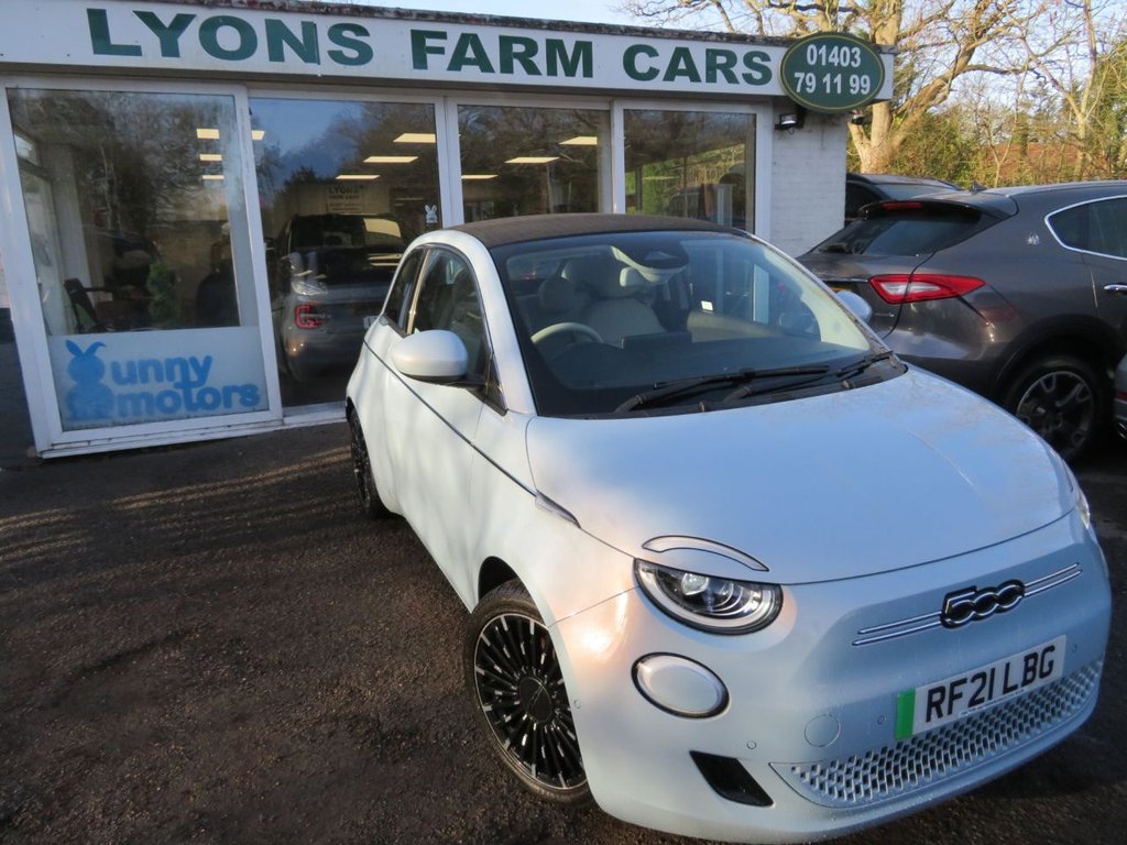 2 Previous Owners, *£1,400+ factory fitted optional extras including; Winter Pack which includes Heated Front Seats & Celestial Blue Pearl Paintwork* Welcome to Bunny Motors, the Fiat 500 specialist with a twist, helping charities whilst supplying the nation with these iconic cars! With 43 international awards since its launch, this city electric car proudly stands out against its rivals, and once you test one youll understand why we love them so much! The detail that has gone into the 500e, from the iconic shape, the stylish interior, to the classical music it plays for pedestrians when pulling away, makes this a truly remarkable car. Plus they are fully automatic! You can save thousands with buying nearly-new and still benefit from its 8 year / 100,000 mile battery warranty balance, along with our vehicle warranty promise. This convertible is the top of range La Prima fnished in the stunning and expensive optional Celestial Blue with Cream Eco Leather Fiat Embossed Seats and comes with both the 3-Pin UK & Mode 3 Charging Cables included. The larger 87kW 42kWh battery achieves an impressive range of up to 199 miles** and generates 118 BHP! The La Prima boasts an array of fantastic features including; 17" diamond alloy wheels, full LED headlights, dashboard fascia and seats upholstered in eco-leather, reverse parking camera with guidelines, front parking sensors with optical display, chrome pack, keyless entry & wireless mobile phone charging! Other notable features include: Wireless Apple CarPlay / Android Auto, 10.25 Touchscreen Infotainment with Navigation and Uconnect Live, Traffic Sign Information, Rain & Dusk Sensor, Cruise Control, TFT 7 Digital Instrument Cluster, Attention Assist (Drowsiness Detection), Automatic Air Conditioning, EV Mode Selector, Drivers seat with memory function, 4 Way Electrically Adjustable Front Passengers Seat, Passive Entry & Keyless Go, Electrically Adjustable and Heated Body Coloured Door Mirrors, Auto Locking Electric Windows, Eco-Leather Steering Wheel with Audio Controls, EV One Pedal Driving, ESC (Electronic Stability Programme) & MSR, ASR & Hillholder, AEBS (advanced emergency braking system, Lane Keep Assist, LED Rear Lights, LED Daytime Running Lights, E-call (SOS), Halogen Headlights Black Bezel, Electronic Parking Brake. Fiat Main Dealer Service Records for both 2022 & 2024 plus a full inspection and service upon arrival to us. S.10.25in Infotainment Touchscreen with Navigation, 12V Socket - Front, 17in Alloy Wheels, 360 Degree Parking Sensors, 6-Way Manually Adjustable Front Seats, 7in TFT Digital Instrument Cluster, ABS - Anti-Lock Braking System, Airbags - Driver, Airbags - Passenger, Attention Assist, Automatic Air Conditioning, Automatic High-Low Beam, Autonomous Emergency Braking - AEB, BAS - Brake Assistance System, Bi-Colour Eco-Leather Steering Wheel with Audio Control, Blind Spot Monitoring, Central Console with Sliding Door Closing Storage Space, Charging Cable - Mode 3, Chrome Exterior Accents, Chrome Window Surrounding, Cruise Control, DAB Radio, Dusk Sensor, E-Call - SOS, Easy Wallbox Home Charging, Eco Leather Seats, Eco-Leather Steering Wheel, Electric Adjustable Wing Mirror with Defrosting Function, Electric Windows - Driver and Passenger One Touch Up-Down, Electrochromatic Dipping Rearview Mirror, Electronic Parking Brake, EV Mode Selector, Fiat Co-Driver - Autonomous Driving L2 with IACC - Intelligent Adaptive Cruise Control and Lane Centering, Floor Mats with 500 logo, Front Armrest, Intelligent Speed Assist and Traffic Sign Recognition, Keyless Entry, Keyless Start, Kick Plate, Lane Centering Assist, LED Daytime Running Lights, LED Headlights, LED Rear Lights, Rack and Pinion with Electric Power Steering, Rain Sensor, Rear Parking Sensors, Rear View Camera, Seats - 50-50 Split - Rear, Smartphone Cradle with Bluetooth, Speakers x6, Steering Wheel Audio Controls, Vehicle Start Button, Wireless Carplay and Android Auto, Wireless Mobile Phone Charger, x2 Front USB Ports