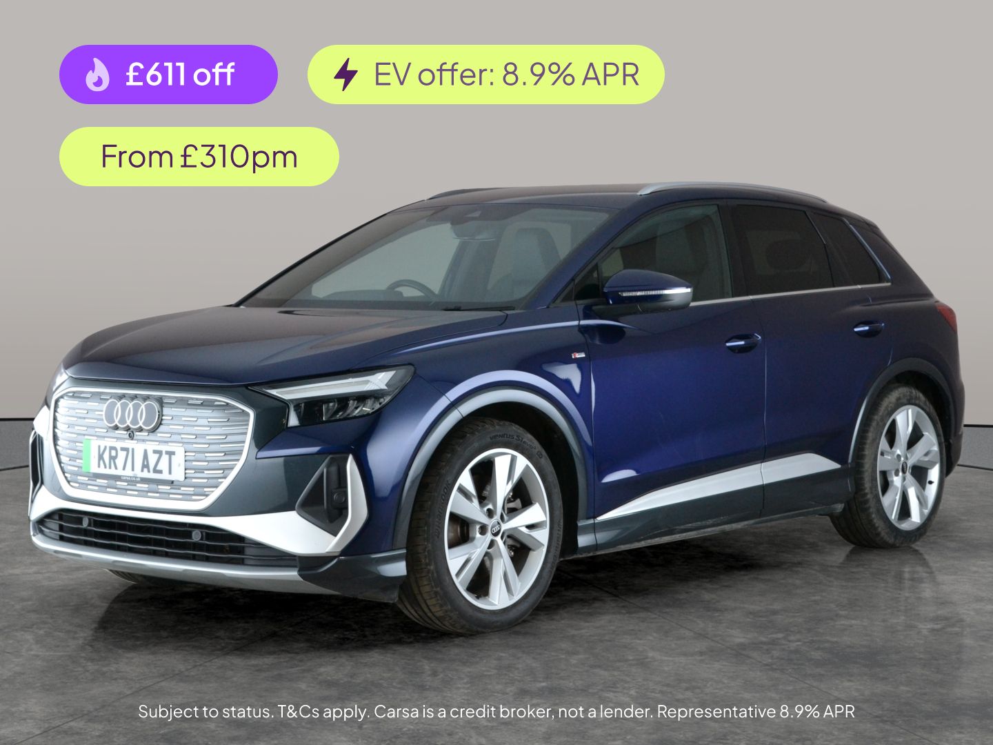 Halesowen0 Previous Owners, Experience electric luxury with this stunning blue Audi Q4 E-tron S line. Enjoy top features like heated S line embossed sport seats, keyless entry, and crystal-clear LED headlights. Stay connected on every journey with MMI Navigation Plus, Apple CarPlay, and WiFi. Safety is a priority with active lane assist and lane departure warning, while the digital driver display and driving modes elevate your drive. Discover comfort, innovation, and exhilarating performance in a stylish SUV package. 2 services recorded, last serviced on 17/12/2025 at 50,758 miles. MOT to 29/10/2026. Visit our website for service history, online valuation, full vehicle specification plus multiple images. Certain features listed may be available via subscription packages at extra costs, please consult with Audi for details. This vehicle is VAT qualifying. Any feature/option specified here is from 3rd party data. We cannot guarantee the accuracy of any specification supplied by a 3rd party. We recommend that you physically check the specification of the vehicle on site prior to purchase. This information does not form part of the buying contract. Terms & Conditions apply. We have over 2,000 cars available from our 10 national branches, check our website to see all our stock. Our Trustpilot rating is 4.4/5 with over 9,000 reviews.