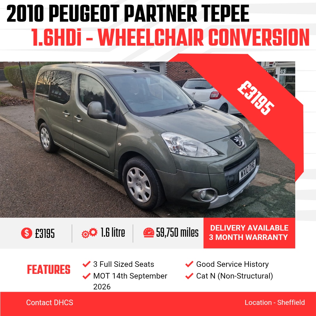 Insurance Group 6, Partial Service History, £3195**WHEELCHAIR ADAPTED**£31952010 PEUGEOT PARTNER TEPEE 1.6HDi WITH WHEELCHAIR CONVERSION 5 SPEED MANUAL GEARBOX 3 FULL SIZED SEATS ONLY 59750 MILES WITH GOOD HISTORY MOT 14th SEPTEMBER 2026 3 MTH WARRANTY INCLUDED IN SCREEN PRICE 2 X REMOTE LOCKING KEYS NEW AFTER MARKET STEREO UNIT ELECTRIC WINDOWS & MIRRORS VERY TIDY MOTOR INSIDE & OUTSIDE ANY INSPECTION / TESTDRIVE WELCOME 2022 CAR WAS PUT ON CAT N (NON STRUCTURAL ) REAR BUMPER AND REAR LIGHT DAMAGED THE CAR LOOKS AND DRIVES GREAT 1st TO SEE WILL BUY CAR BASED IN SHEFFIELD (DELIVERY AVAILABLE ) CALL O79OO458817 TO ARRANGE A VIEWING PART EX CONSIDERED AT TRADE VALUE ONLY **PLEASE ASK FOR A QUOTE IF DELIVERY PREFERRED **