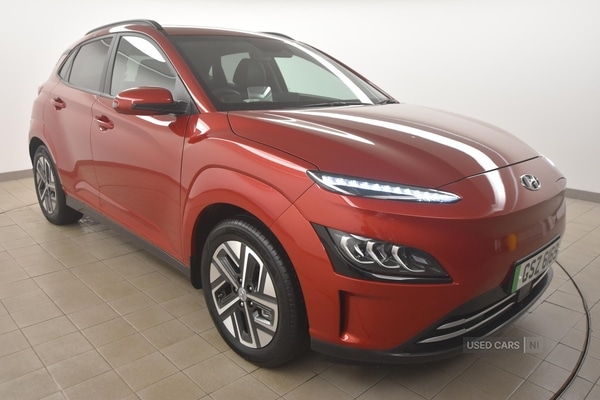 0 Previous Owners, This Hyundai KONA 150kW Ultimate 64kWh Auto suits a broad spectrum of drivers, offering an electric powertrain with 16,764 miles recorded. The vehicle's automatic transmission ensures a smooth, refined driving experience, while the advanced electric system delivers an efficient and quiet journey. Features such as heated and ventilated front seats, leather upholstery, and a panoramic glass sunroof contribute to a comfortable and well-appointed interior environment.With 204 bhp and a 0-60 mph time of 7.9 seconds, this model offers brisk acceleration suitable for a variety of driving situations. The top speed is 104 mph, allowing for confident motorway driving. Performance benefits are further enhanced by features like regenerative brake shift paddles and drive mode selector, providing flexibility and control for the driver.Presented in red, this KONA is enhanced by body-colour door mirrors and handles, roof rails, and privacy glass for a cohesive and modern appearance. Full LED MFR headlights, LED daytime running lights, and LED rear lights not only accentuate the vehicle's style but also improve visibility. The electric tilt and slide sunroof, along with rear side wing doors, further add to the aesthetic appeal and functionality.Equipment highlights include a 10.25-inch touchscreen satellite navigation system with Bluelink, a head-up display, and Bluetooth connectivity. Safety and driver assistance systems are comprehensive, incorporating lane keep assist, blind spot collision avoidance, adaptive cruise control, and a parking system with rear camera and sensors. Comfort is addressed through automatic climate control, ambient lighting, and a wireless charging pad, ensuring a convenient and reassuring ownership experience