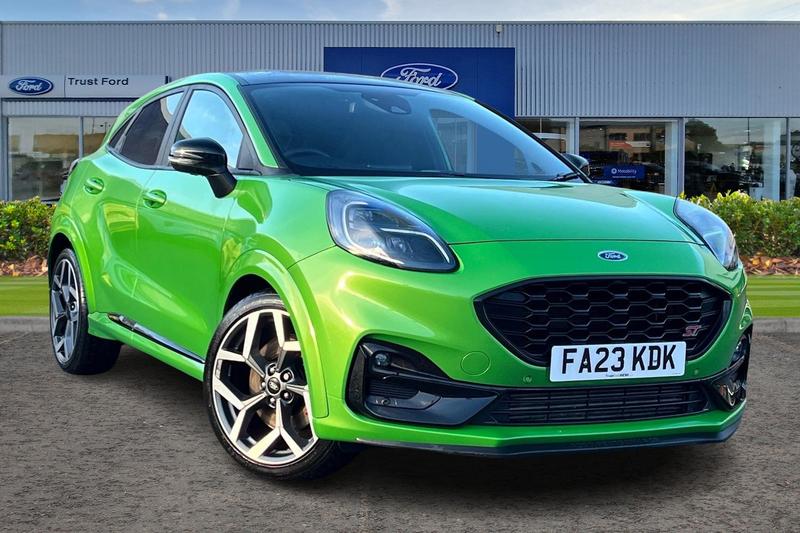 Insurance Group 22, Cruise control with Intelligent speed assist, Driver impairment monitor, Emergency call service, Ford easy fuel, Front and rear parking sensors, Full digital 12.3 instrument cluster, Lane keeping aid with lane departure warning, Power assist steering, Selectable drive modes (normal, sport, eco, track), Speed sign recognition, Automatic headlights with auto high beam, Automatic rain sensing wipers, Dual chrome exhaust, Fixed LED signature headlamps, Front fog lamps, LED daytime running lights, LED rear lamps, Power foldable heated door mirrors with puddle lamps and puma logo protection, Privacy glass to side rear windows and tailgate glass, Quickclear heated windscreen, Rear side wing doors, Rear wiper, ST scuff plates, Third brake light, Unique ST body styling kit including wing mirrors and Ford Performance embossed splitter, 3 seat bench in 2nd row, Alloy sports pedals, Centre console with armrest and stowage, Ford megabox extended bootspace, Ford Performance sensico partial premium leather upholstery with metal grey stitching, Front and rear floor mats, Front and rear head restraints, Manual 6 way driver seat adjust with lumbar adjustment, Manual 6 way passenger seat with lumbar seat adjustment, Single front passenger seat, ST flat bottomed steering wheel with metal grey stitching, ST logo projection, Unique ST gear shift knob, Wireless charging pad with electronic air temperature control (EATC), 3 rear seatbelts, Child safety lock, Electronic stability control (ESC) and