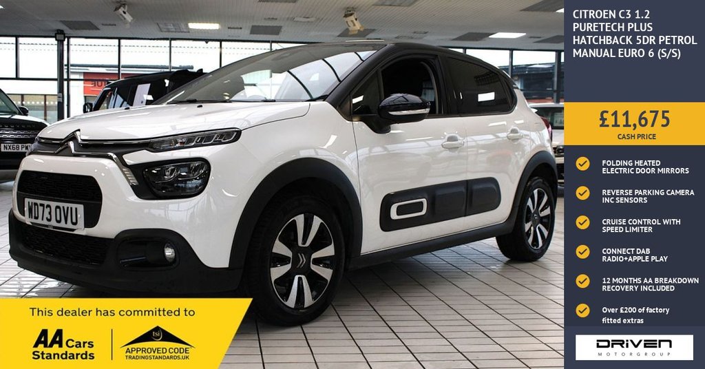 Insurance Group 16, 1 Previous Owner, CITROEN C3 1.2 PURETECH PLUS HATCHBACK 5DR FINISHED IN POLAR WHITE AND COMPLIMENTED WITH TWO TONE CHARCOAL INTERIOR, THIS VEHICLE HAS BEEN VERY WELL CARED FOR AND MAINTAINED PLUS COMPREHENSIVE PRE DELIVERY HEALTH CHECK AND SERVICE COMPLETED PRIOR TO SALE AT 19020 MILES. KEY FEATURES INCLUDE ALLOY WHEELS, ALARM, AIR CONDITIONING, CRUISE CONTROL WITH SPEED LIMITER, REAR TINTED WINDOWS, ELECTRIC HEATED FOLDING DOOR MIRRORS, LANE ASSIST, REAR PARKING SENSORS WITH REVERSE CAMERA, STEERING WHEEL AUDIO AND TELEPHONE CONTROLS PLUS MUCH MORE. COMMITTED TO AA CARS STANDARDS: 3 MONTHS OR 3000 MILES WARRANTY INCLUDED WITH AN OPTION TO UPGRADE: 12 MONTHS AA BREAKDOWN RECOVERY INCLUDED: £75.00 CONTRIBUTION TOWARDS YOUR NEXT SERVICE/MOT AT ANY AA CARS STANDARD APPROVED WORKSHOP: WE STAND BY THE QUALITY OF OUR VEHICLES. WITH THE PURCHASE OF THIS VEHICLE, YOU WILL RECEIVE 3 MONTHS OR 3000 WARRANTY, 12 MONTHS AA BREAKDOWN RECOVERY, GIVING YOU ADDITIONAL PEACE OF MIND AND PROTECTION. ALL OUR CARS COME WITH AT LEAST 6 MONTHS MOT AND PRE SALE HEALTH CHECK AND ROAD TEST. OUR PROFESSIONAL TEAM ENSURES YOUR VEHICLE STAYS IN TOP CONDITION, AND YOU ENJOY A HASSLE-FREE OWNERSHIP EXPERIENCE. 4.7 STARS ON GOOGLE WITH OVER 550 REVIEWS: JOIN OUR COMMUNITY OF SATISFIED CUSTOMERS! OUR DEALERSHIP IS PROUD TO HAVE A 4.7 STAR RATING ON GOOGLE, BACKED BY OVER 550 POSITIVE REVIEWS. WE ARE COMMITTED TO PROVIDING EXCELLENT SERVICE AND HIGH-QUALITY VEHICLES. This Vehicle Comes Equipped with High Specification, Which Includes: - Drive this car home with complete confidence and satisfaction: All cars proudly offered by driven group are rigorously inspected, hpi checked and prepared to the highest standard To drive this car home, visit www.drivegroup.co.uk or call 01642-601999 to arrange an appointment with our sales team Please note we do not operate an organised distance selling scheme as defined by the consumer contracts (cancellation, information and additional charges) regulations 2013. Therefore, even if you choose to not view your vehicle at our premises prior to purchase,you will not be entitled to cancel your order under any 14 day cancellation period. All other statutory rights remain unaffected. Whilst every effort has been made to ensure the accuracy of the information contained in this website, please check with us about any item which may affect your decision to purchase. Driven motor group shall not be liable for any errors, inaccuracies or delays in content. .1 USB Connection, 12V Socket, 16in Alloy Wheels - Matrix - Bi-tone, 2-3 - 1-3 Split Folding Rear Bench, 3D Rear Lights Signature, ABS - Anti-Lock Braking System, Airbags - Driver, Airbump on Side Door Panel, Anti-Theft Alarm, Automatic Activation of Hazard Warning Lights in Case of Severe Deceleration, Automatic Air Conditioning, Automatic Door and Boot Locking when in Motion, Body Colour Door Handles, Body Colour Front and Rear Bumpers, Boot Light, Central Locking with Locked Indicators and Interior One-Touch Lock Button, Chrome Decoration on Front Face - Under Chevrons and around Daytime Running Lights, Citroen Connect DAB Radio with 6 Speakers, Citroen Illuminated Signature in LED Headlights and LED Daytime Running Lights, Cloth with Standard Ambience - Gloss Black, Coffee Break Alert, Cruise Control with Speed Limiter, Dark Tinted - Rear Side and Tailgate Windows, Day-Night Switchable Interior Rear View Mirror, Driver and Front Seatbelts with Pyrotechnic Pretensioners and Force Limiters, Drivers and Passengers Sunvisor with Courtesy Mirror - Non Illuminated, Electric Child Locks, Electrically Adjustable - Heated Folding Door Mirrors, ESP - Electronic Stability Programme with Anti-Skid System, Fog Lights Integrated into the Front Bumper, Front Head Restraint with Height Adjustment, Front Lighting Panel with Map Reading Lights, Front Passenger Airbag - Can be Deactivated, Front Seats Adjustable with Forward-Back Slide and Adjustable Backrest, Front Sequential Electric Windows with One-Touch - Open-Close and Anti Pinch System, Front Side Airbags and Front and Rear Curtain Airbags, Gloss Black Dashboard with Grey Surround, Glossy Black Colour Pack, Height Adjustable Drivers Seat, Height and Reach Adjustable Steering Wheel, Hill Start Assist, Instrument Cluster with White LCD and Analogue Gauges, ISOFIX Mountings on Outer Rear Seats with Top Tether and Labels Indicating Fixing Points, Lane Departure Warning System, LED Daytime Running Lights, LED Headlights, Manual Parking Brake with Chrome Finish Button, Matt Black B Pillars, Monotone Horn, Multi-Function On-Board Trip Computer, Parcel Shelf, Polar White, Power Assisted Steering, Puncture Repair Kit, Rear Parking Sensors, Rear Sequential Electric Windows with One-Touch - Open-Close and Anti Pinch System, Rear Windscreen Wiper with Intermittent Mode Linked to Vehicle Speed and Automatic Activation when Reverse Gear Selected, Remote Central Locking with Two Plip Keys, Reversing Camera, Roof - Bi-Tone - Perla
