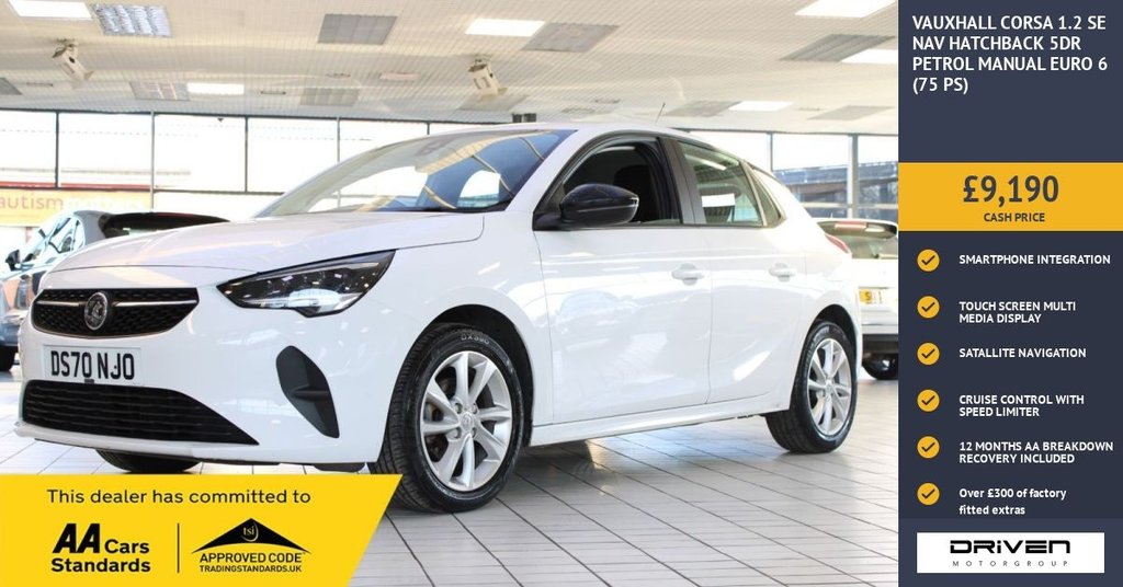 Insurance Group 10, 0 Previous Owners, VAUXHALL CORSA 1.2 SE NAV FINISHED IN SUMMIT WHITE AND COMPLIMENTED WITH CHARCOAL TWO TONE CLOTH INTERIOR, THIS VEHICLE HAS BEEN VERY WELL CARED FOR AND MAINTAINED WITH DOCUMENTED SERVICE HISTORY CARRIED OUT PLUS COMPREHENSIVE PRE DELIVERY HEALTH CHECK COMPLETED PRIOR TO SALE AT 36417 MILES. KEY FEATURES INCLUDE ALLOY WHEELS, LARGE COLOUR TOUCHSCREEN, AIR CONDITIONING, BLUETOOTH WITH AUDIO STREAMING, CRUISE CONTROL WITH SPEED LIMITER, DAB RADIO, ELECTRIC HEATED ADJUSTABLE DOOR MIRRORS, ELECTRIC WINDOWS, LANE ASSIST, MULTIMEDIA SATALLITE NAVIGATION SYSTEM, SMARTPHONE INTEGRATION, STEERING WHEEL MOUNTED CONTROLS, USB CONNECTION, VAUXHALL CONNECT, AUTOMATIC HEADLIGHTS, PRIVACY GLASS PLUS MUCH MORE. COMMITTED TO AA CARS STANDARDS: 3 MONTHS OR 3000 MILES WARRANTY INCLUDED WITH AN OPTION TO UPGRADE: 12 MONTHS AA BREAKDOWN RECOVERY INCLUDED: £75.00 CONTRIBUTION TOWARDS YOUR NEXT SERVICE/MOT AT ANY AA CARS STANDARD APPROVED WORKSHOP: WE STAND BY THE QUALITY OF OUR VEHICLES. WITH THE PURCHASE OF THIS VEHICLE, YOU WILL RECEIVE 3 MONTHS OR 3000 WARRANTY, 12 MONTHS AA BREAKDOWN RECOVERY, GIVING YOU ADDITIONAL PEACE OF MIND AND PROTECTION. ALL OUR CARS COME WITH AT LEAST 6 MONTHS MOT AND PRE SALE HEALTH CHECK AND ROAD TEST. OUR PROFESSIONAL TEAM ENSURES YOUR VEHICLE STAYS IN TOP CONDITION, AND YOU ENJOY A HASSLE-FREE OWNERSHIP EXPERIENCE. 4.7 STARS ON GOOGLE WITH OVER 550 REVIEWS: JOIN OUR COMMUNITY OF SATISFIED CUSTOMERS! OUR DEALERSHIP IS PROUD TO HAVE A 4.7 STAR RATING ON GOOGLE, BACKED BY OVER 550 POSITIVE REVIEWS. WE ARE COMMITTED TO PROVIDING EXCELLENT SERVICE AND HIGH-QUALITY VEHICLES. This Vehicle Comes Equipped with High Specification, Which Includes: - .12V Electrical Accessory Socket, 16in Alloy Wheels - 4 Twinspoke - Silver, 20 Watts Per Channel Output, 3.5in Colour Information Display, 60-40 Split-Folding Rear Seat Back, 7in Central Colour Touch Screen, ABS - Anti-Lock Braking System, Active Bonnet - Headlight - Wiper Structure, Air Conditioning, Airbags - Front Seat Side-Impact, Audio Information, Automatic Emergency Braking - AEB, Black Lower Side Window Mouldings, Bluetooth A2DP Audio Streaming, Bluetooth Mobile Phone Portal, Body Colour Door Handles and Mirror Housing, Body Coloured Front and Rear Bumpers, Body Coloured Roof and A-Pillars, Cabin Particulate Filter, CBC - Cornering Brake Control, Central Facia Display, Centre Rear Brake Light, Child Proof Locks on Rear Doors, Chrome Logo Bar, Comfort Front Seats, Cruise Control with Intelligent Speed Limiter, DAB Digital Radio, Deactivation Switch for Front Passengers Airbag, Deflation Detection System, Digital Clock with Automatic RDS Time Adjustment, Door Handles - Interior - Chrome Effect, Door Mirrors - Electrically Adjustable-Heated, Drag Torque Control, Driver Drowsiness System, Drivers Airbag, Drivers and Front Passengers Sunvisor Incorporating Vanity Mirrors with Covers, Drivers Seat - Six-Way Adjustable, EBA - Emergency Brake Assist, EBD - Electronic Brakeforce Distribution, Electrically Operated Front Windows, Electronic Engine Deadlock Immobiliser, ESP - Electronic Stability Programme, Forward Collision Alert, Four Adjustable Facia Vents, Four-Speed Fan with Illuminated Controls, Fresez Fabric with Mistral Fabric Side Bolsters - Marvel Black, Front Camera System, Front Passengers Airbag, Front Passengers Seat - Four-Way Adjustable, Fuel Gauge with Low Fuel Warning Light, Full Length Curtain Airbags, Glazed Tailgate with Heated Rear Windows with Wash-Wipe Facility, Hazard Warning Lights, Headlight Levelling System, Headlights - High Beam Assist, Height Adjustable Front and Rear Seat Head Restraints, Hill Start Assist, Illuminated Glovebox with Lid, Inertia-Reel Lap and Diagonal Seatbelts, Integrated Tailgate Spoiler, Interior Courtesy Lights and Front Map Reading Light, ISOFIX Child Seat Mountings Points Located on Outer Rear Seats, Jet Black Door Panels, Lane Keep Assist with Lane Departure Warning, LED Daytime Running Lights, LED Headlights, Lights On Audible Warning, Luggage Compartment - Illumination, Mistral Facia, Multimedia Navi System, Outside Air Temperature Display Incorporating Ice Warning Function, Radio - AM-FM with 25 Station