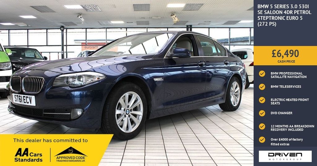 Stockton On TeesInsurance Group 39, 1 Previous Owner, BMW 5 SERIES 3.0 530I SE SALOON 4DR PETROL STEPTRONIC FINISHED IN DEEP SEA BLUE AND COMPLIMENTED WITH OYSTER DAKOTA LEATHER INTERIOR, THIS VEHICLE HAS BEEN VERY WELL CARED FOR AND MAINTAINED WITH DOCUMENTED SERVICE HISTORY CARRIED OUT AT 17421, 32928, 41466, 44309, 55689, 67313, 86971 MILES PLUS COMPREHENSIVE PRE DELIVERY HEALTH CHECK AND SERVICE COMPLETED PRIOR TO SALE AT 92052 MILES. KEY FEATURES INCLUDE OVER £4000 OPTIONAL EXTRAS INCLUDING AUTOMATIC FOLDING HEATED DOOR MIRRORS, DVD CHANGER, BUSINESS ADVANCED MULTIMEDIA PACKAGE AND SATALLITE NAVIGATION, TELEPHONE VOICE CONTROL, OTHER KEY FEATURE INCLUDE ALARM, AMBIENT INTERIOR LIGHTING, AUTO DIMMING REAR VIEW MIRROR, BMW PROFESSIONAL SINGLE CD AND MP3 PLAYER, BMW TELESERVICES, CRUISE CONTROL WITH BRAKE FUNCTION, BLUJETOOTH, AUTOMATIC HEADLIGHTS, HEATED WASHER JETS, KEYLESS START, M-SPORT SUSPENSION, REAR PARKING DISTANCE CONTROL, ELECTRIC HEATED FRONT SEATS, USB AUDIO PLUS MUCH MORE. COMMITTED TO AA CARS STANDARDS: 3 MONTHS OR 3000 MILES WARRANTY INCLUDED WITH AN OPTION TO UPGRADE: 12 MONTHS AA BREAKDOWN RECOVERY INCLUDED: £75.00 CONTRIBUTION TOWARDS YOUR NEXT SERVICE/MOT AT ANY AA CARS STANDARD APPROVED WORKSHOP: WE STAND BY THE QUALITY OF OUR VEHICLES. WITH THE PURCHASE OF THIS VEHICLE, YOU WILL RECEIVE 3 MONTHS OR 3000 WARRANTY, 12 MONTHS AA BREAKDOWN RECOVERY, GIVING YOU ADDITIONAL PEACE OF MIND AND PROTECTION. ALL OUR CARS COME WITH AT LEAST 6 MONTHS MOT AND PRE SALE HEALTH CHECK AND ROAD TEST. OUR PROFESSIONAL TEAM ENSURES YOUR VEHICLE STAYS IN TOP CONDITION, AND YOU ENJOY A HASSLE-FREE OWNERSHIP EXPERIENCE. 4.7 STARS ON GOOGLE WITH OVER 550 REVIEWS: JOIN OUR COMMUNITY OF SATISFIED CUSTOMERS! OUR DEALERSHIP IS PROUD TO HAVE A 4.7 STAR RATING ON GOOGLE, BACKED BY OVER 550 POSITIVE REVIEWS. WE ARE COMMITTED TO PROVIDING EXCELLENT SERVICE AND HIGH-QUALITY VEHICLES. This Vehicle Comes Equipped with High Specification, Which Includes: - .12V Power Socket - Front x2, 17in Alloy Wheels - Light V Spoke Style - 236, 18in Alloy Wheels - Light M Double Spoke - 350M, ABS - Anti Lock Braking System, Air Conditioning - Automatic with Extended Features, Airbags - Curtain, Airbags - Driver, Airbags - Driver and Front Passenger Side, Airbags - Passenger, Airbags - Passenger Deactivation, Alarm System Thatcham 1 with Remote Control, Ambient Interior Lighting, Armrest - Front Centre, Armrest - Rear Centre, Automatically Dimming Rear View Mirror, Auxiliary Input, BMW Assist, BMW Assist Online Portal, BMW Online services, BMW Professional Radio - Single CD and MP3, BMW TeleServices, CBC - Cornering Brake Control, Child Seat ISOFIX Attachment - Front and Rear, Crash Sensor, Cruise Control with Brake Function, Cup Holders - Front x2 and Rear x2, Dakota Leather - Oyster, Deep Sea Blue, Deformation Zones - Front and Rear, Door Mirrors - Aspheric Electric Adjustment, Door Mirrors - Folding - Automatically Dimming, Door Mirrors - Heated, DSC - Dynamic Stability Control - Stabilises the Vehicle in Extreme Situations - Controls Traction, DTC - Dynamic Traction Control, DVD Changer, EBD - Electronic Brake-Force Distribution, Electric Windows - Front and Rear with Open-Close Fingertip Control, Enhanced Bluetooth Telephone Functionality, Enhanced Bluetooth Telephone Functionality with Telematics, Exterior Trim - Chromeline, Floor Mats - Velour, Front Fog Lights, Headlights - Automatic Activation, Heated Windscreen Washer Jets, Interior Trim - Aluminium Hexagon with Black High Gloss Finisher, Interior Trim - Black High Gloss, Keyless Start, M Aerodynamic Bodystyling, M Sport Suspension, Media Package - Business Advanced, Multifunction Controls for Steering Wheel, Navigation System - BMW Business Advanced, OBC - On-Board Computer, OBD - On Board Diagnosis, PDC - Park Distance Control - Front and Rear, PDC - Park Distance Control - Rear, Rain Sensor with Automatic Headlight Activation, Remote Control Locking, Run Flat Tyres, Seats - Front - Part Electric Adjustment, Seats - Front Heated, Servotronic Steering, Side Impact Protection, Smokers Package, Steering Column with Manual Reach and Rake Adjustment, USB Audio Interface, Voice Control - Phone, Windows - Heat Insulated Tinted All Round