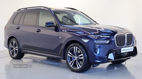 0 Previous Owners, This 2023 BMW X7 40d M Sport is a rare find, boasting a single owner and remarkably low mileage for its age. As a BMW manufacturer approved vehicle, it offers peace of mind, featuring a powerful 3.0L Diesel Hybrid engine paired with a Four Wheel Drive drivetrain for assured performance in all conditions. This Euro 6 compliant X7 comfortably seats seven occupants and provides ample boot space for all your needs. Notable features include Comfort Access with keyless entry, allowing for effortless access, and the advanced Parking Assistant Pro, complete with a 360 degree camera and rear camera, making manoeuvring simple.The X7 40d M Sport stands out with its impressive acceleration, reaching 0-62mph in a swift 5.9 seconds, demonstrating its dynamic capability. This performance, combined with its substantial 2200 kg towing weight, indicates that this vehicle offers a superior driving experience and versatility compared to many others in its class. The M Sport trim further enhances its appeal, delivering a sporty aesthetic and refined driving dynamics. Mild Hybrid Technology, EU6 RDE II exhaust emissions standard, 21'' 754 M Double-spoke Bi-colour Alloy W, Sport Automatic Transmission with Gearsh, Run-flat Tyres, Iconic Glow Kidney Grille, High-gloss Shadowline Roof Rails, Alarm System, Comfort Access, Soft-close Doors, Fineline Black wood. high gloss w/ Metal, Ambient Lighting, Extended Storage Contents, Front Comfort Seats, Heated front seats, High-Beam Assistant, Active Protection, Active Guard, Parking Assistant Pro, BMW TeleServices, BMW Emergency Call, BMW Online Services, Connected Package Pro (limited duration), Storage for wireless charging, Personal eSIM, Live Cockpit Pro with Head up Display, Gesture Control, DAB Radio, Harman/Kardon Surround Sound Audio, M Sport Exterior Styling, High-gloss Shadowline Exterior Trim, Anthracite Alcantara Headlining, M Sport Package, M Sport Brakes with Blue Calipers, Towbar, Sun Protection Glass. Blue 7 seats. BMW Approved Used Car
