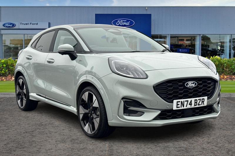 Insurance Group 12, Drivers Assistance Pack, BLIS Blind Spot Information System, Adaptive Cruise Control, Heated Seats, Heated Steering Wheel, Bang Olufsen Sound System , Power Tailgate, Panoramic Glass Roof , 360 Camera, Charging Mat, Satellite Navigation System, Front + Rear Parking Sensors , Climate Control, Push Button Start, Part Leather Seats , Privacy Glass, Cruise Control + Speed Limiter, Lane keeping aid with lane departure warning, Quickclear heated windscreen, Driver impairment monitor, Emergency call service, Ford easy fuel, Full digital 12.8 instrument cluster, Power assist steering, Selectable drive modes(Normal, Eco, Sport, Slippery and Trail), Speed sign recognition, Automatic headlights with rain sensing wipers and auto high beam, Front fog lamps, LED daytime running lights, LED rear lamps, LED third brake light, Power foldable heated door mirrors with puddle lamps and puma logo protection, Rear side wing doors, Rear wiper, ST-Line X body styling kit, 3 seat bench in 2nd row, 4 way lumbar support for passenger seat, Centre console with armrest and stowage, Ford megabox extended bootspace, Front and rear head restraints, Front floor mats, Manual 4 way driver seat adjust with lumbar adjustment, Single front passenger seat, ST-Line X Premium synthetic leather upholstery, 3 rear seatbelts, Child safety lock, Electronic stability control (ESC) and hill start assist, Pre-collision assist with autonomous emergency braking, pedestrian/cyclist detection & post-collision braking, Tyre