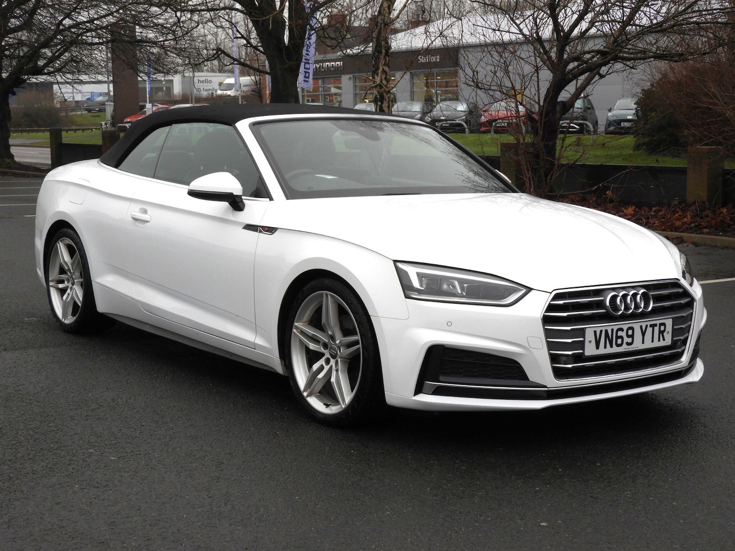 Stafford0 Previous Owners, This 2019 Audi A5 Cabriolet TFSI S line boasts a single owner and an MOT valid until January 2027, offering peace of mind for its next custodian. This stylish convertible features a 2.0 litre petrol engine and is Euro 6 compliant, contributing to its low CO2 emissions. The S line trim enhances its sporty appeal, while notable features include striking LED headlights with dynamic rear indicators, a light and rain sensor for automatic headlight activation, and heated front seats for added comfort. Inside, you'll find deluxe 3-zone electronic climate control to keep everyone comfortable, and a Bluetooth interface for seamless connectivity.The partial service history, with the last service completed on 21st January 2026 at 63,921 miles, indicates consistent care. The combination of its low CO2 emissions, a comprehensive MOT, and the desirable S line specification positions this Audi A5 Cabriolet as a compelling choice compared to similar vehicles. Its single owner provenance further underscores its well maintained condition, making it an attractive option for those seeking a premium convertible experience.