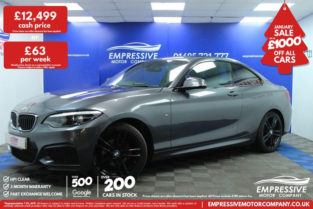 Merthyr TydfilInsurance Group 21, 2 Previous Owners, ****BRILLIANT BMW**** Just in! This Stunning 2019 BMW 2 SERIES 1.5 218i GPF M Sport Coupe 2dr Petrol Manual Euro 6 (s/s) (136 ps) Finished In Grey! 67,332 miles - 2.0L diesel - 6 speed manual - 18" gloss black wheels - Automatic angel eye LED headlights - Alcantara seating - Parking sensors - I drive infotainment system with sat nav - Bluetooth connectivity - USB - Automatic climate control - Traction control - Eco mode - Sport mode - Speed limiter - Voice control - Automatic wipers .12V Power Socket - Centre Console, 12V Power Socket - Passenger Footwell, 18in Alloy Wheels - M Light Double-Spoke Style 719 M Bicolour Jet Black, Access to BMW Connected Plus (12 Month Subscription From New), Active Differential Brake - ADB Sport - Electronic Differential Lock in DSC-Off Mode, Air Conditioning - Automatic - Single Zone, Airbags, Alarm System - Thatcham 1 with Remote Control and Engine Immobiliser, Ambient Lighting - Switchable, Armrest - Front with Sliding Adjustment, Automatically Dimming Rear View Mirror, Battery Age Recognition Function, Battery Safety Cut Off, Bluetooth Hands-Free Facility with USB Audio Interface and Audio Streaming, BMW ConnectedDrive Online Services, BMW ConnectedDrive Services, BMW Emergency Call, BMW Navigation, BMW Professional Radio with Single CD Player - with MP3 Playback Compatibility, BMW TeleServices, Brake Pad Wear Indicator - Front and Rear, Bumper System - Front and Rear, Central Locking Switch - Doors - Fuel Filler Cap - Luggage Compartment, Check Control Warning System for Monitoring of Lights and Door-Luggage Compartment Open Warning, Child Seat ISOFIX Attachment for the Two Outer Rear Seats, Coat Hooks - Integrated into Rear of B Pillar, Condition Based Service, Crash Sensor, Cup Holders x2 with Sliding Cover and Inlay Mat, DAB Digital Radio, Darkened Tail Lights with LED Light Bars, Daytime Driving Lights, Direction Indicator - Side Repeaters - Integrated in Exterior Mirrors, Direction Indicator Lights - Clear Lenses, Door Sill Finishers - M Designation, Drive Performance Control - ECO PRO - Comfort - Sport - Sport Plus, DSC - Dynamic Stability Control Plus, Dynamic Brake Lights, ECO PRO Mode, Electric Windows - Front and Rear with Open-Close Fingertip Control - Anti-Trap Facility and Comfort Closing Function, Engine Cover with BMW Roundel and TwinPower Turbo Designation, EPS - Electric Power Steering, Exhaust Tailpipe - Chrome - Single - Round - Left, Exterior Mirrors Electrically Adjustable, Exterior Parts in Body Colour, Exterior Trim - High-Gloss Shadowline, First Aid Kit and Warning Triangle, Floor Mats - Velour, Full Black Panel Display, Gearshift Lever with M Designation - Short-Shift, Glove Box, Handbrake Lever and Gear Lever Knob in Leather, Headlining - Anthracite, Heat Protection Glazing with Green Tint, High Level Third Brake Light, Instrument Cluster, Interior Lighting - Front Centre Over Interior Mirror and Rear Centre, Interior Trim - Aluminium Hexagon Trim Finishers with Estoril Blu