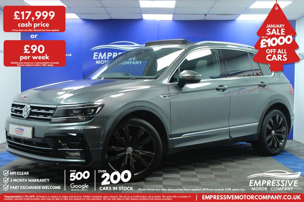 Insurance Group 17, 1 Previous Owner, ****TERRIFIC TIGUAN**** Just in! This Stunning 2019 VOLKSWAGEN TIGUAN 2.0 TDI RLine Tech SUV 5dr Diesel DSG 4Motion Euro 6 (s/s) (150 ps) Finished In Grey! 80,575 miles 2.0L diesel Automatic 4 wheel drive 20" graphite wheels Automatic LED headlights Sliding panoramic sun roof Powered tailgate 360 reverse camera Park assist Parking sensors Half leather Rline heated seats Touch media screen with sat nav Bluetooth with apple car play USB Aux Start stop Electric handbrake Eco mode Sport mode Voice control Adaptive cruise control Speed limiter Paddle shift Electric folding mirrors Heated mirrors .12V Socket Luggage Compartment, 12V Socket in Centre Console in Storage Area, 12V Socket on Rear of Front Centre Armrest, 18 Degree Angle of Approach, 20in Alloy Wheels Suzuka, 4MOTION Active Control, ABS AntiLock Braking System, Active Bonnet, Active Info Display, Adaptive Cruise Control, Airbags, Alarm with Interior Protection with Deactivation via Infotainment System, AluminiumLook Decorative Inserts in Dash and Door Panels, Ambient Lighting Pack, Area View with Park Assist, Automatic ComingLeaving Home Lighting Function, Automatic Dimming Rear View Mirror, Automatic Hazard Lights Activation Under Emergency Braking, Black Rooflining, Body Coloured Bumpers and Door Handles, BodyColoured Door Mirrors with Integrated Indicators, BodyColoured Roof Spoiler Rear, CarNet App Connect, CarNet Guide and Inform (3 Year Subscription From New), CarNet Security and Service including eCall, Carpet Mats Front and Rear, Chrome Side Window Surrounds, Chrome Trim on Radiator Grille Upper and Lower, Climate Control 3Zone Electronic Air Conditioning with Automatic Air Recirculation, Coasting Function, Composition Media System, Cup Holders Front x2, Discover Navigation TouchScreen NavigationInfotainment System with CarNet Guide and Inform, Driver Alert System Fatigue Detection, Driver Profile Selection Choice of Three Settings Eco Normal and Sport Modes, Drivers and Passengers Safety Optimised Head Restraints, Dusk Sensor Automatic Driving Lights, Dynamic Light Assist, Electric Windows Front and Rear, Electrically Foldable Door Mirrors, ElectricallyOperated Tailgate Opening and Closing Function, Electronic Engine Immobiliser, Electronic Parking Brake with Auto Hold Function, ESC Electronic Stability Control, Folding Table on Back of Front Seats, Front Air Intake with Chrome Strip, Front Assist Radar Sensor Controlled Distance Monitoring System City Emergency Braking System and Predictive Pedestrian Protection, Front Centre Armrest with Storage Compartment Longitudinal and Height Adjustable and Two Rear Air Vents, Front Fog Lights with Static Cornering Function, Front Footwell Illumination, Front Passengers Seat Folding Backrest, Front Seat Back Storage Pockets, Front Seats with RLine Logo on Rear Seat Backrest, Glovebox Cooled, Heated Front Seats, Heated Rear Window, Heated Windscreen Washer Jets, Height and Reach Adjustable Steering Wheel, HeightAdjustable Front ThreePoint Seat Belts with Tensioners, High Level 3rd Brake