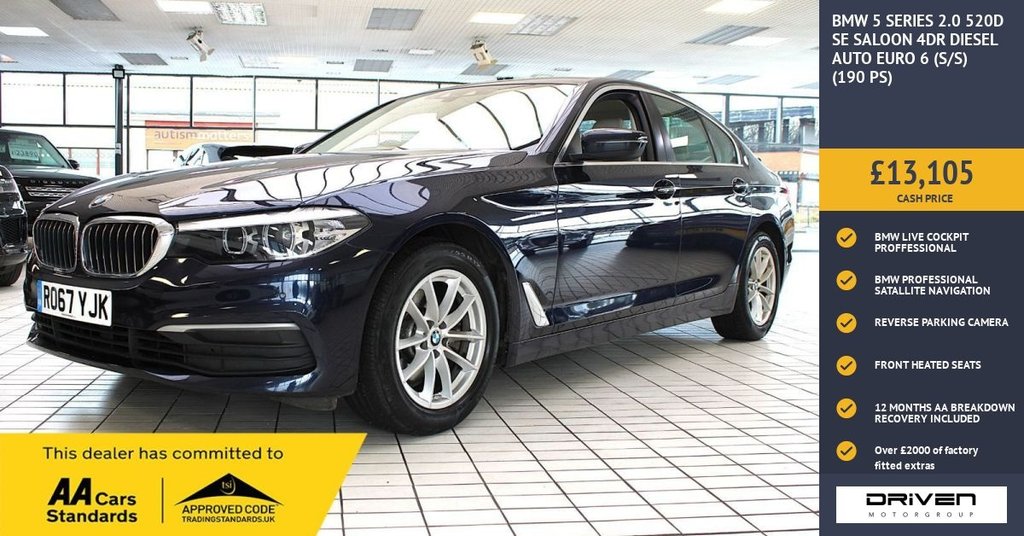 Stockton On TeesInsurance Group 30, 0 Previous Owners, BMW 5 SERIES 2.0 520D SE SALOON 4DR DIESEL AUTO FINISHED IN IMPERIAL BLUE XIRALLIC AND COMPLIMENTED WITH DAKOTA IVORY & BLACK LEATHER INTERIOR, THIS VEHICLE HAS BEEN VERY WELL CARED FOR AND MAINTAINED WITH DOCUMENTED SERVICE HISTORY CARRIED OUT AT 19414, 38663, 52412, 63542, 65516, 68628, 79072 MILES PLUS COMPREHENSIVE PRE DELIVERY HEALTH CHECK COMPLETED PRIOR TO SALE AT 79709 MILES. KEY FEATURES INCLUDE OVER £3000 OPTIONAL EXTRAS INCLUDING FOLDING MIRROS WITH ANTIDAZZLE, LUMBAR SUPPORT, FRONT ELECTRIC DRIVER MEMORY, THROUGH LOAD SYSTEM, REVERSE ASSIST CAMERA, REMOTE SERVICES, OTHER KEY FEATURES INCLUDE FRONT HEATED SEATS, SPORT MULTIFUNCTIONAL STEERING WHEEL, HEATED WASHER JETS, AUTOMATIC AIR CONDITIONING, ALARM, BLUETOOTH HANDS FREE WITH USB INTERFACE, BMW PROFESSIONAL RADIO WITH CD PLAYER, TOUCHSCREEN SENSITIVE DISPLAY SCREEN, CRUISE CONTROL WITH BRAKE FUNCTION, DAB RADIO, DIGITAL COCKPIT, FOLDING HEATED DOOR MIRRORS, BMW SATALLITE NAVIGATION PLUS MUCH MORE. COMMITTED TO AA CARS STANDARDS: 3 MONTHS OR 3000 MILES WARRANTY INCLUDED WITH AN OPTION TO UPGRADE: 12 MONTHS AA BREAKDOWN RECOVERY INCLUDED: £75.00 CONTRIBUTION TOWARDS YOUR NEXT SERVICE/MOT AT ANY AA CARS STANDARD APPROVED WORKSHOP: WE STAND BY THE QUALITY OF OUR VEHICLES. WITH THE PURCHASE OF THIS VEHICLE, YOU WILL RECEIVE 3 MONTHS OR 3000 WARRANTY, 12 MONTHS AA BREAKDOWN RECOVERY, GIVING YOU ADDITIONAL PEACE OF MIND AND PROTECTION. ALL OUR CARS COME WITH AT LEAST 6 MONTHS MOT AND PRE SALE HEALTH CHECK AND ROAD TEST. OUR PROFESSIONAL TEAM ENSURES YOUR VEHICLE STAYS IN TOP CONDITION, AND YOU ENJOY A HASSLEFREE OWNERSHIP EXPERIENCE. 4.7 STARS ON GOOGLE WITH OVER 550 REVIEWS: JOIN OUR COMMUNITY OF SATISFIED CUSTOMERS! OUR DEALERSHIP IS PROUD TO HAVE A 4.7 STAR RATING ON GOOGLE, BACKED BY OVER 550 POSITIVE REVIEWS. WE ARE COMMITTED TO PROVIDING EXCELLENT SERVICE AND HIGHQUALITY VEHICLES. This Vehicle Comes Equipped with High Specification, Which Includes: .17in Alloy Wheels Light VSpoke 618, 20GB Hard Disc Drive HDD Memory, Access to BMW Connected Plus (12 Month Subscription From New), Active Air Stream Kidney Grille, Active Guard, Air Conditioning Automatic, Airbags, Alarm System Thatcham 1 with Remote Control and Engine Immobiliser, All Round AntiCorrosion System, Ambient Lighting, Anti Roll Bars Front and Rear, Armrests, Battery in Luggage Compartment with Jump Start Facility in Engine Bay, Bluetooth Hands Free with USB Audio Interface, BMW ConnectedDrive Online Services, BMW ConnectedDrive Services, BMW Emergency Call, BMW Professional Radio with Single CD Player MP3 and DVD Playback Compatibility, BMW TeleServices, Brake Force Display, Child Seat ISOFIX Attachment Two in Rear Includes Top Tether, Control Display 10.25in Colour Touch Sensitive Display Screen, Crash Sensor Activating Central Locking Hazard Warning Lights Fuel Cut Off Interior Lights, Cruise Control with Brake Function, Cup Holders Front x2 and Rear x2, DAB Digital Radio, Dakota Leather Ivory White with Black Interior, Daytime Running Lights LED, Deformation Zones Front and Rear, Digital Cockpit, Door Sill Finishers BMW Designation, Drive Performance Control with ECO PRO Comfort and Sport Modes, DSC Dynamic Stability Control Stabilises the Vehicle in Extreme Situations Controls Traction, Dynamic Brake Lights with LED Technology, Electric Windows Front and Rear with OpenClose Fingertip Control AntiTrap Facility and Comfort Closing Function, Electro Mechanical Parking Brake With Automatic DriveAway and AutoHold Function, Engine Cover with TwinPower Turbo Designation, EPS Electric Power Steering with Servotronic, Exhaust Tailpipes Single Left and Right Chrome, Exterior Door Handle Illumination, Exterior Mirrors Electrically Adjustable and Heated includes Integrated Direction Indicators, Exterior Mirrors Folding with Anti Dazzle, Favourite Buttons, First Aid Kit and Warning Triangle, Floor Mats Velour, Follow Me Home Headlight Function, Footwell Lights Front and Rear, Glove Compartment Lockable and Illuminated, Head Restraints Front AntiWhiplash, iDrive Touch Controller with Shortcut Buttons, Imperial Blue Xirallic, Interior RearView Mirror with Automatic AntiDazzle Function, Interior Trim Aluminium Fine Cutting with Highlight Trim Finishers Pearl Chrome, LED Headlights, Locking Wheel Bolts Thatcham Approved, Lumbar Support Driver and Front Passenger, Mobility Kit