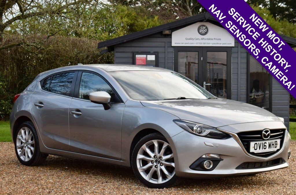 1 Previous Owner, Welcome to CarPod and our advert for this Metallic Aluminium Silver Mazda 3 2.2 SkyActivD Sport Nav which joins us with just 2 Owners from New, Service History (services at 37k, 45k, 64k, 80k and 84k miles) and comes with an MOT showing No Advisories until 11th January 2027. Loaded with features including Heated Seats, HeadsUp Display, Sat Nav, Reversing Camera, Front and Rear Parking Sensors, Cruise Control, DAB Radio, Bluetooth, Alloy Wheels and 2 Remote Keys. Call now to book your personal viewing, alternatively scan the QR Code to request a walk around video of this car! Highly competitive finance available with £0 deposit, call us for an instant quote. Credit & Debit Cards Accepted. Maximum £250 Credit Card Payment accepted. We deliver nationwide upon request. For more info, photos, videos or to arrange a viewing, please call us on 07703 581764 or visit www.carpod.com. We are proud winners of the Highly Commended Award for Car Retailer Customer Service Excellence, presented to us at the Auto Industry Excellence Awards 2020..12V Power Socket Front, 18in Alloy Wheels, ABS Anti Lock Braking System, Adjustable Speed Limiter, Aha App and Stitcher App Integration, Air Conditioning Dual Zone Climate Control, Airbags Curtain Front, Airbags Curtain Rear, Airbags Driver, Airbags Front Passenger, Airbags Front Passenger Deactivation System, Aluminium Silver, Armrest Front Centre with Storage Box, Armrest Rear, Audio Systems AMFM RadioCD Player, Auto Dimming Rear View Mirror, AUX Socket, Body Coloured Door Mirrors, Cruise Control, Cupholder Front x2, Cupholder Rear x2, Dashboard Decoration Panel Silver, Deadlocking, Digital Speedometer, Door Handles Body Coloured, Door Mirrors Electrically AdjustableHeatedFolding, Door Pockets Front, DSC Dynamic Stability Control, Dusk Sensing Automatic Headlights, Electric Windows Front and Rear with One Touch Auto Up and Down on Drivers Side, Emergency Stop Signalling System ESS, Engine StartStop Button, Front Fog Lights with Chrome Surround, Front Side Airbags, Gear Knob Leather, Glovebox Illumination, Grab Handles Front Passenger and Two Rear with Coat Hooks, Handbrake Leather Wrapped, Head Restraints Rear, Head Up Display, Headlights Adaptive Front Lighting System, Headlights Automatic Levelling, Headlights BiXenon, Headlights Cleaning, Hill Hold Assist, Immobiliser, Integrated Bluetooth System, Interior Light Dome with Integral Spot Light, ISOFIX Child Seat Anchorage for Outer Rear Seats, LED Daytime Running Lights, Luggage Compartment Light, Multimedia Commander, Overhead Console with Sunglassess Holder, Parking Sensors Front, Pollen Filter, Power Assisted Steering Electronic, Premium BOSE Centrepoint Surround System Speakers x9, Privacy Glass Rear and Rear Side Windows, RainSensing Front Wipers, Rear Lights LED, Rear Parking Sensors, Remote Central Locking, Satellite Navigation European Mapping with 3years Map Updates, Satellite Navigation System, SCR Secondary Collision Reduction, Seatback Pocket Passenger Side, Seatbelt Reminder for Front and Rear, Seats 6040 Split Folding Rear, Seats Drivers Dial Reclining and Height Adjustment, Seats Drivers Manual Lumbar Adjustment, Seats Front Heated, Shark Fin Antenna, Smart City Brake Support, Smart Keyless Entry, Spoiler Rear Roof, Steering Wheel Leather, Steering Wheel Mounted Audio and Bluetooth Controls, Steering Wheel Tilt and Height Adjustment, Sunvisors Drivers and Passengers with Covered Vanity Mir