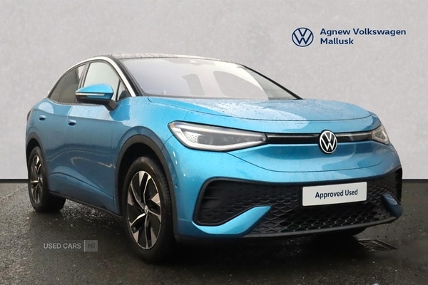 Newtownabbey0 Previous Owners, Volkswagen ID.5 Match 77kWh Pro 286PS in Costa Azul Blue with black roof Interior Style Plus with power adjustable front seats with memory, 30 Colour interior ambient lighting, Heated steering wheel Infotainment Pack Plus with Discover Pro navigation system, wireless phone charger, augmented reality head up display, Harman Kardon sound system Assistance Package Plus with semiautomated driving, Travel Assist, Side Assist, Rear Traffic Alert, Park Assist Pro, 360 parking cameras, Keyless entry, Power tailgate Approved Used with VW warranty until February 2028