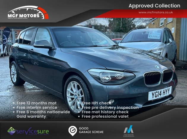 Insurance Group 19, Partial Service History, This 2014 BMW 1 Series 118d SE presents a compelling proposition with its remarkably low mileage of just 87515 miles for its age. This particular model benefits from a 2.0L diesel engine, offering an efficient yet capable driving experience. The SE trim level includes practical features such as manual air conditioning to keep you comfortable, automatic headlight activation for convenience, and a windscreen with a grey shade band for reduced glare. Furthermore, the Sun Protection Package, including Sun Protection Glazing, adds an extra layer of privacy and helps to keep the cabin cooler.The BMW 1 Series 118d SE stands out with several key advantages. Its acceleration from 0 to 62mph in just 8.9 seconds demonstrates a lively performance that surpasses many vehicles in its class. This model also boasts a low insurance group, which can contribute to lower running costs. Practicality is another strong point, with generous boot space making it ideal for carrying luggage or shopping. These combined attributes make this 1 Series a well rounded and attractive choice.Has been well maintained in its life with 6 service records as follows 22/03/17 27,476 18/03/19 46,002 07/03/20 59,014 20/01/22 66,461 02/01/25 84200 22/01/2026 87513Has also just received a fresh 12 months MOT with no advisories so is ready to drive away today with 6 months warranty as standard for added peice of mind
