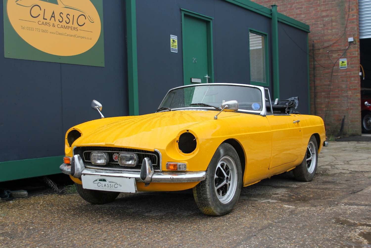 Trimms GreenThe MG B has long been held in high regard throughout the classic car world. Excellently stylish, well performing and backed by a wealth of enthusiast support and parts supply, these golden era British sports cars make great usable classics and the example we have here could become one such car. An early chrome bumper roadster, this 1972 roadster has been subject to an extensive repaint in striking yellow as part of a planned restoration by the previous keeper, however a change of plans means this is now being offered to market in its current form, needing "finishing off". With the engine turning over, some good quality parts and a vibrant repaint, this car really can be seen to hold great potential as a fun project for the winter or upcoming summer months. The bodywork itself is fundamentally well and can be considered presentable, benefitting from new fibreglass front wings. There are some lighter blemishes to the paint finish in places along with some overspray, however it likely that once everything is put back together this car will thoroughly look the part. The folding soft top roof looks in relatively good form and unlatches and folds with ease. The cabin can be considered OK, showing some signs of wear and tear consistent with a halted recommissioning project. The seats appear to have originally been black and were in the process of being dyed a very fitting brown hue. Mechanically the car is being sold as a non runner. We have had the car turning over comfortably and feel that to someone with the right know how, this car should start quite easily. **Registration for the car is FAO 871K**