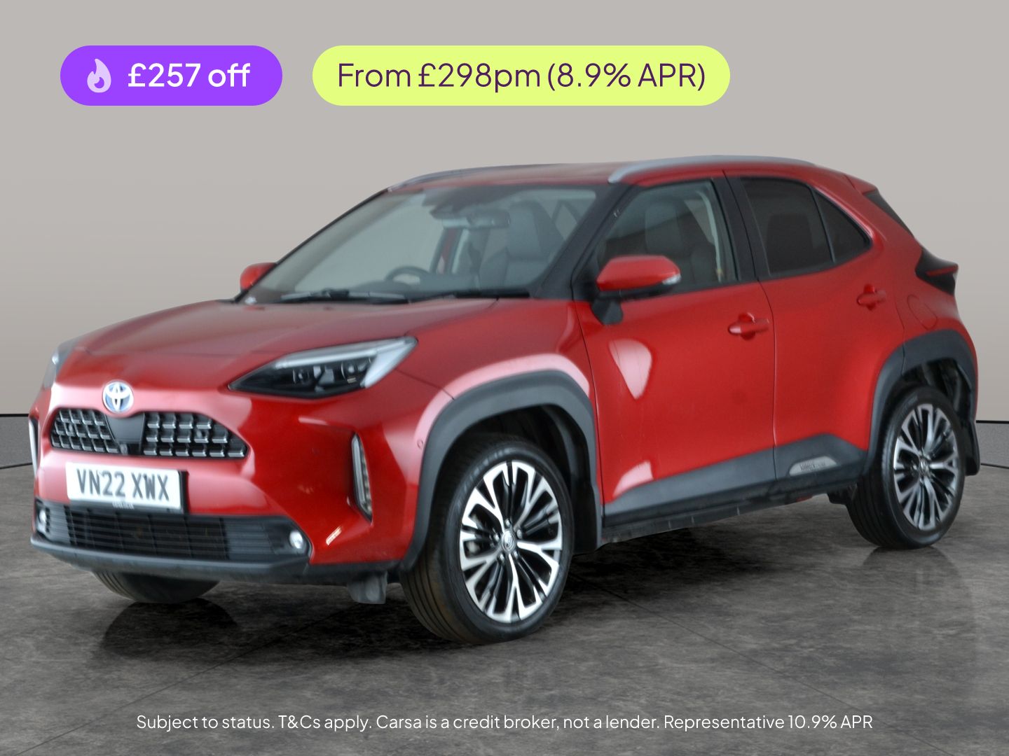 Insurance Group 12, 1 Previous Owner, Discover the Toyota Yaris Cross, an advanced red SUV with keyless entry, adaptive cruise control, and handsfree boot release for easy access. Enjoy the comfort of heated seats and a heated steering wheel, plus electric seats for a perfect driving position. Stay safer with blind spot assist, lane trace assist, and a reversing camera. Let Apple CarPlay and Bluetooth audio streaming keep you connected, while builtin sat nav guides the way. This is smart hybrid driving with style, comfort, and peace of mind. 3 services recorded, last serviced on 22/10/2025 at 38,943 miles. MOT to 20/10/2026. Visit our website for service history, online valuation, full vehicle specification plus multiple images. Any feature/option specified here is from 3rd party data. We cannot guarantee the accuracy of any specification supplied by a 3rd party. We recommend that you physically check the specification of the vehicle on site prior to purchase. This information does not form part of the buying contract. Terms & Conditions apply. We have over 2,000 cars available from our 10 national branches, check our website to see all our stock. Our Trustpilot rating is 4.4/5 with over 9,000 reviews.