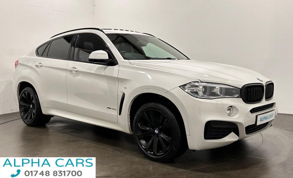Insurance Group 44, Striking BMW X6 40D M Sport X Drive Euro 6 Powerful 315 BHP at Alpha Cars .Electric Glass Sunroof , Full Leather , Heated Steering Wheel , Heated Rear Seats , Reverse Park Camera, 12V Power Socket Rear of Centre Console x2, 12v Power Socket Small Folding Compartment in Centre Console, 12V Power Sockets, 20GB HDD Memory, 20in Alloy Wheels Light M Double Spoke Style 469M, 402040 Split Folding Rear Seats, Active Security Package, Adaptive M Suspension, Air Breather Black High Gloss, Air Conditioning Automatic with TwoZone Control and Extended Features, Airbags, Alarm System Thatcham 1 with Remote Control and Engine Immobiliser, All Round AntiCorrosion System with Partial Hot Galvanising Phosphate Treatment and Cathodic Dip Paintwork Preservation of Hollow Cavities Underfloor Protection, Alpine White, Ambient Lighting Colour Selection, Armrest Front with Storage Compartment, Automatic StartStop Button, Automatically Dimming Rear View Mirror, Auxiliary Input Point for Auxiliary Playing Devices, Bluetooth Hands Free with USB Audio Interface, BMW ConnectedDrive Online Services, BMW ConnectedDrive Services, BMW Emergency Call, BMW Professional Radio with Single CD Player with MP3 Playback Compatibility, BMW TeleServices, Brake Force Display, Check Control Warning System, Child Locking System Rear Doors, Child Seat ISOFIX Attachment Rear, Cold Weather Package, Concierge Service, Courtesy Lights Front and Rear with Soft OnOff Dimming, Crash Sensor Activating Central Locking Hazard Warning Lights Fuel Cut Off Interior Lights, Cruise Control with Brake Function, Cup Holders Front and Rear, DAB Digital Radio, Dakota Leather Black with Black Interior, Deformation Zones Front and Rear, Direction Indicator Side Repeaters Integrated in Exterior Mirrors, Door Handles Body Colour, Door Mirrors Aspheric Tinted Heated Electric Adjustment, Door Sill Finishers M Designation, Downlights in Exterior Door Handles, Driving Assistant, DSC Dynamic Stability Control Plus, ECO PRO Mode, Electric Windows Front and Rear with OpenClose Fingertip Control AntiTrap Facility and Comfort Closing Function, ElectroMechanical Parking Brake with AutoHold Function, Exhaust Tailpipes Single Left and Right Chrome Quadrilateral, Extended Storage, Exterior Trim High Gloss Shadowline, Favourite Buttons, First Aid Kit and Warning Triangle, Floor Mats Velour, Folding Side Mirrors with AutoDimming, Follow Me Home Headlight Function, Footwell Lights Front with LED, Full Black Panel Display