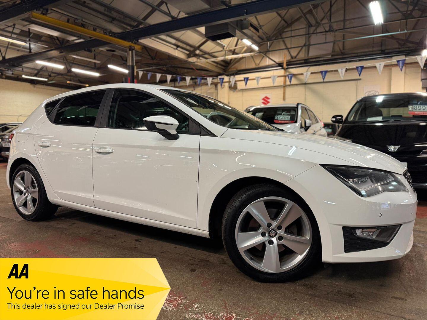 LeicesterInsurance Group 20, 2 Previous Owners, SEAT Leon 1.4 TSI ACT FR Euro 6 5dr ULEZ FR SPORT LONG MOT FREE 6 MONTHS NATIONWIDE WARRANTY This 2015 SEAT Leon 1.4 TSI ACT FR is a Euro 6 petrol hatchback and ULEZ / emissions charge exempt, making it ideal for city driving, commuting and motorway use. Finished in stunning white, this FR model offers sporty styling, strong performance and excellent fuel economy.Powered by the 1.4 TSI petrol engine, the Leon delivers impressive acceleration while remaining economical, thanks to ACT cylinder deactivation technology. The FR trim adds sports suspension, upgraded interior and exterior styling, making this one of the most desirable Leon models available. 1.4 TSI Petrol Manual Euro 6 ULEZ Compliant MOT until January 2027 6Month Warranty Included Low CO2 Emissions HPI Clear FR Sports Seats & FR Styling Front & Rear Parking Sensors with Optical Display DualZone Climate Control Air Conditioning Cruise Control Bluetooth HandsFree & Audio Streaming 17in FR Alloy Wheels FlatBottom FR Leather Steering Wheel Drive Mode Selection (Sport / Comfort / Eco) LED Rear Lights & Tinted Rear Windows Large Boot with Split Folding Rear Seats ISOFIX Child Seat PointsThis SEAT Leon FR petrol manual is ideal for buyers searching for a sporty hatchback, ULEZ compliant car, cheap to run petrol, or a reliable Euro 6 vehicle with excellent specification and long MOT.