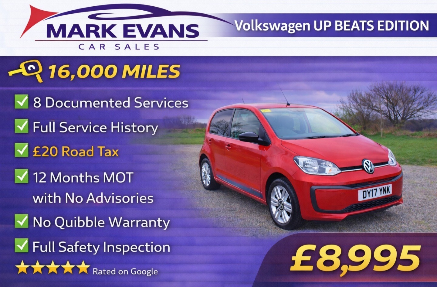 St AgnesInsurance Group 3, BEATS Special Edition Only 16,000 MILES FULL SERVICE HISTORY £20 ROAD TAXThis Volkswagen Up BEATS SPECIAL EDITION has covered just 16,000 MILES from new and comes with a FULL SERVICE HISTORY including 8 DOCUMENTED SERVICES. It is presented in perfect condition both inside and out and is a genuinely outstanding example. ULTRA LOW MILEAGE cars of this calibre are extremely rare, especially in such a desirable limited edition specification..... The vehicle will be supplied with a brand new 12 month advisory free MOT, a three month parts and labour warranty, a full professional valet and a complete safety inspection, providing total peace of mind...... The BEATS SPECIAL EDITION is renowned for its superb factory fitted 300 watt six speaker BEATS audio system, transforming the cabin into an immersive listening experience while retaining the solid build quality Volkswagen is known for. Distinctive BEATS BADGING, black door mirrors, special trim details and the unique starburst dashboard design give this model a genuinely cool and individual feel. Despite its compact size, the Up offers impressive space for four occupants and a practical boot, proving that small does not have to mean basic..... Easy to drive, refined on the motorway and extremely economical, the Up delivers light steering, a smooth clutch and a precise gear change, making it a pleasure both in town and on longer journeys. With just £20 ROAD TAX and legendary Volkswagen build quality, it is one of the best city cars available. At just £8995, this exceptional low mileage Volkswagen Up Beats Edition represents outstanding value and is a rare opportunity to purchase such a high quality example in flawless condition...... We specialise in sourcing the very best low mileage high quality vehicles. Mark Evans Car Sales is based in St Agnes Cornwall. We pride ourselves on our honesty integrity and five star service. Please take a moment to read our five star Google reviews, we are very proud of them. The Evans family has been in the motor trade in Cornwall for over 50 years and we continue to work hard to uphold our reputation for quality and trust.