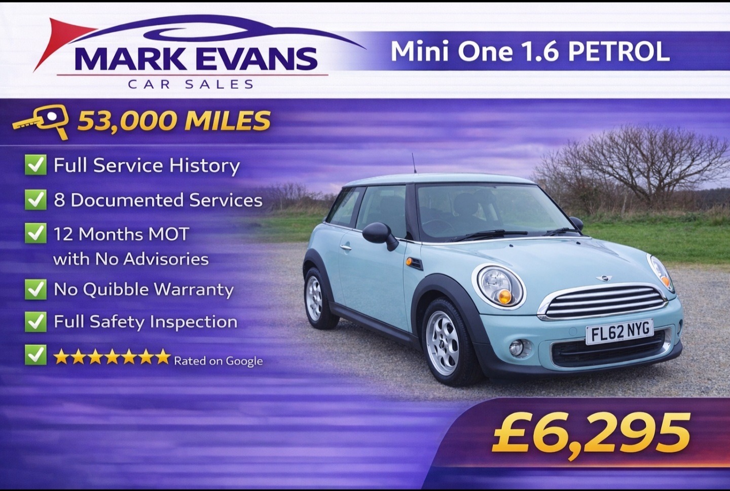 St AgnesInsurance Group 13, Only 53,000 MILES FULL SERVICE HISTORY..... This Mini One has covered just 53,000 MILES from new and comes with a FULL SERVICE HISTORY including 8 DOCUMENTED SERVICES. Finished in the highly desirable Ice Blue, it is presented in pristine condition both inside and out and has clearly been exceptionally well cared for. This is a genuinely lovely example that looks and drives superbly..... The vehicle will be supplied with a brand new 12 month advisory free MOT, a three month parts and labour warranty, a full professional valet and a complete safety inspection, providing total peace of mind.......Powered by the smooth and reliable 1.6 petrol engine, this Mini offers low running costs while delivering the fun and engaging driving experience the brand is famous for. It benefits from excellent specification including Bluetooth connectivity, air conditioning, remote central locking, push button start, alloy wheels and ISOFIX child seat points. Stylish, comfortable and economical, it is an ideal first car or a premium small daily driver.... At just £6295, this well maintained low mileage Mini One represents excellent value and is a fantastic opportunity to own a high quality example in outstanding condition.We specialise in sourcing the very best low mileage high quality vehicles. Mark Evans Car Sales is based in St Agnes Cornwall. We pride ourselves on our honesty integrity and five star service. Please take a moment to read our five star Google reviews, we are very proud of them. The Evans family has been in the motor trade in Cornwall for over 50 years and we continue to work hard to uphold our reputation for quality and trust.