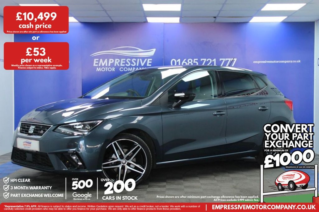 Insurance Group 14, 1 Previous Owner, ****SUPER SEAT**** Just in! This Stunning 2019 SEAT IBIZA 1.0 TSI FR Sport Hatchback 5dr Petrol Manual Euro 6 (s/s) GPF (115 ps) Finished In Grey! 65,947 miles 1.0L petrol 18" diamond cut wheels LED headlights Parking sensors Digital cockpit Touch screen media system Sat nav Bluetooth App connect USB Aux Climate control Start stop Eco mode Sport mode Voice control Cruise control Auto lights Folding wing mirrors.18in Alloy Wheels Performance BiColoured Machined, 6 Litre Glovebox, Active Front Head Restraints, Alarm Perimeter and Interior Monitoring with Backup Horn and TowAway Protection, AntiLock Braking System ABS, AntiTheft Roof Antenna, Auto Dimming Rear View Mirror, AutoHeadlights, Automatic Warning Lights, Bluetooth Audio Streaming with Handsfree System, BodyColoured Door Handles, Brilliant Black Painted Door Mirrors, Child Locks on Rear Doors, Coming Home Leaving Home Headlight Function, Cruise Control, DAB Digital Audio Broadcasting, Dark Tinted Rear Windows, Digital Clock, Digital Cockpit, Dimming Interior Rear View Mirror, Driver and Front Passenger Airbags, Driver and Passengers Sunvisors, Driver Sunvisor with Mirror and Card Holder, Dual Zone Climate Control, Dust and Pollen Filter, Electric Windows Front with OneTouch and AntiSqueeze, Electrically Adjustable Folding and Heated Door Mirrors, ElectroMechanical Power Steering SpeedSensitive, Electronic Engine Immobiliser, Emergency Tyre Repair Kit, ESC Electronic Stability Control with EBA Emergency Brake Assist, Exclusive FlatBottomed FR Steering Wheel and Interior Details, Exclusive FR Rear Bumpers, Exhaust Pipe Twin, FMAM Radio, Front and Rear Seatbelt Reminders, Front Assist, Front Courtesy Light with Front and Rear Reading Lights, Front Fog Lights with Cornering Function, Front Passenger Airbag DeActivation, Front Side and Curtain Airbags, Full LED Headlights, Full Link Smartphone Integration, Gearshift Indicator, Height Adjustable Front Passenger Seat, Height and Reach Adjustable Steering Wheel, HeightAdjustable Drivers Seat, Hill Hold Control, Ice Metal Side Door Panels, Illuminated Boot, Instrument Lighting with Brightness Control, ISOFIX Points in Outer Rear Seats with Top Tether Anchorage Points, Leather Handbrake, Leather Steering Wheel and Gear Knob, Leatherette Dashboard, LED Daytime Running Lights, Lights Left On Warning Buzzer, Locking Wheel Bolts, Low Fuel Warning Light, Media System Plus, Multi Coloured Ambient Lighting, MultiCollision Braking System, Navigation System, Outside Temperature Gauge, Radiator Grille Frame in Chrome, Rain Sensing Wipers, Rear Fog Light, Remote Central Locking with Deadlocks, RPM Counter, SEAT Drive Profile, SEAT Logo Tailgate Release, Seats Sports FR, Six Speakers, Split Folding Rear Seats 6040, Sports Suspension, Third Rear Headrest, ThreePoint Seatbelts on All Rear Seats, Tiredness Recognition System, Trip Computer