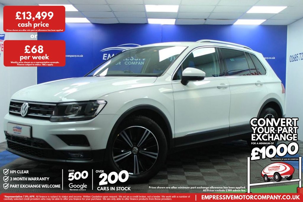 Insurance Group 11, 2 Previous Owners, ****TERRIFIC TIGUAN**** Just in! This Stunning 2018 VOLKSWAGEN TIGUAN 1.4 TSI SE SUV 5dr Petrol Manual Euro 6 (s/s) (125 ps) Finished In White! 64,297 miles 1.5L petrol 6 speed manual 18" diamond cut wheels Automatic LED headlights Parking sensors Touch media screen Bluetooth with apple car play USB Aux Automatic 2 zone climate control Start stop Electric handbrake Adaptive cruise control Voice control Speed limiter Lane keep assist Electric folding mirrors Heated mirrors .12V Socket Luggage Compartment, 12V Socket in Centre Console in Storage Area, 12V Socket on Rear of Front Centre Armrest, 18 Degree Angle of Approach, 18in Alloy Wheels Patagonia, ABS AntiLock Braking System, Active Bonnet, Adaptive Cruise Control, Airbags, Alarm with Interior Protection with Deactivation via Infotainment System, Automatic ComingLeaving Home Lighting Function, Automatic Dimming Rear View Mirror, Automatic Hazard Light Activation Under Heavy Braking, Black Grained Lower Door Protectors with Chrome Insert, Body Coloured Bumpers and Door Handles, BodyColoured Door Mirrors with Integrated Indicators, CarNet App Connect, Carpet Mats Front and Rear, Chrome Side Window Surrounds, Chrome Trim on Radiator Grille Upper and Lower, Chrome Trimmed Front Air Intake Strip, Climate Control 3Zone Electronic Air Conditioning with Automatic Air Recirculation, Coasting Function, Composition Media System, Cup Holders Front x2, Driver Alert System, Drivers and Front Passengers Under Seat Drawer, Drivers and Passengers Safety Optimised Head Restraints, Dusk Sensor Automatic Driving Lights, Electric Windows Front and Rear, Electrically Foldable Door Mirrors, Electronic Engine Immobiliser, Electronic Parking Brake with Auto Hold Function, ESC Electronic Stability Control, Folding Table on Back of Front Seats, Front Assist with Pedestrian Monitoring Detection and City Emergency Braking, Front Centre Armrest with Storage Compartment Longitudinal and Height Adjustable and Two Rear Air Vents, Front Comfort Seats with Height and Lumbar Adjustment, Front Fog Lights with Static Cornering Function, Front Footwell Illumination, Front Passengers Seat Folding Backrest, Front Seat Back Storage Pockets, Glovebox Cooled, Halogen Clear Headlights Range Adjustable via Infotainment System, Heated Rear Window, Height and Reach Adjustable Steering Wheel, HeightAdjustable Front ThreePoint Seat Belts with Tensioners, High Beam Assist, High Level 3rd Brake Light, Instrument Lighting White Adjustable Panel Illumination, Interior Light Delay, Isofix Child Seat Preparation EasyFit For 2 Outer Rear Seats, Lane Assist, LED Rear Number Plate Lights, Load Lashing Points x4 in Luggage Compartment, Load Through Provisions with Rear Centre Armrest and 2 Cup Holders, Luggage Compartment Cover Removable, Luggage Compartment Light, Multifunction Colour Display, Multifunction Computer, Parking Sensors Front and Rear, Power Assisted Steering Speed Sensitiv