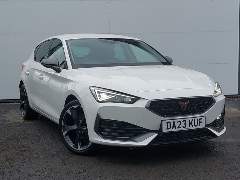 KilmarnockInsurance Group 20, 0 Previous Owners, Full link smartphone integration with Mirror Link, wireless Apple CarPlay and wired Google Android Auto, Park assist (inc front/rear parking sensors), Rear view camera, Media system plus with navigation pack Leon Cupra, 18" Machined sport black and silver alloy wheels with 92Y tyres, Safety and driving pack (M) Cupra leon, Wireless phone charger, Start/stop system with regenerative braking, Service interval indicator, Lockable tailgate, Lane assist, Front assist with forward collision warning braking reaction to vehicles, pedestrians and cyclists, Electro mechanical speed sensitive power steering, Ecall, Digital cockpit, CUPRA drive profile selection with 4 modes (Comfort/Cupra/Sport/Individual), throttle response and gearshift mode, Sports suspension, Auxiliary input socket, 7 speakers, Third brake light, Separate daytime running light with automatic headlight control and coming home feature, Rear wash/wipe, Rear side wing doors, Rear diffuser with twin exhaust pipe on each side, Rain sensing wipers, LED headlights with dynamic turn signals, tail lights, rear fog lights with rear coast to coast lighting, LED front fog lamps with cornering function, Electrically adjustable, heated and folding door mirrors, Electric front/rear windows, Dark tinted rear windows, Cupra sports bumpers, Body coloured bumpers, Body colour door handles, Auto dimming rear view mirror, 3 seat bench in 2nd row, 12v power supply in centre console, 5 headrests, 60/40 split rear bench seat with armrest, Ambient lighting with glovebox, footwell and single monocolour, Cupra Leather flat bottomed, perforated steering wheel and gearshift paddles, Driver/passenger manual seat height adjustment, Four x USB Type C ports, Front and rear reading lights X 4, Folding boot cover, Front centre armrest, Front seats manual lumbar adjustment, Grey headlining, Height/reach adjust steering wheel, Illuminated interior front door sills, Three zone climate control, Sunvisors with illuminated mirror, Storage pockets on rear of front seats, Sports seats, Single front passenger seat, PVC/Cloth upholstery with copper stitching, Jack and tool kit, ISOFIX points in outer rear seats with top tether anchorage points, Driver and front passenger airbags with front passenger airbag deactivation, front side and curtain airbags, Cupra black brake calipers, Child proof door locks, Brake control system ESC and brake booster, ABS, 3 point seatbelts on all rear seats, Tyre pressure monitoring system, Tiredness