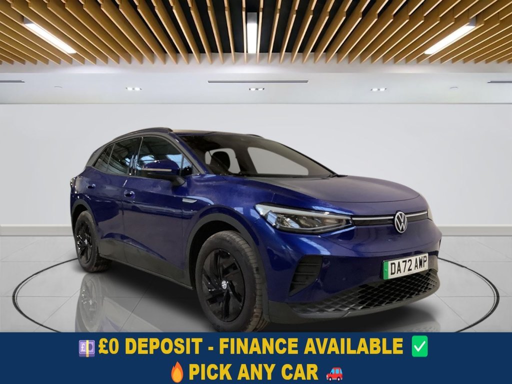 Insurance Group 18, 0 Previous Owners, Why This Volkswagen ID.4 Wins? This 2022 Volkswagen ID.4 Pure Life is a superb oneowner electric SUV with just 32,702 miles, offering a refined, quiet drive and the smooth power delivery EVs are known for. Its 55 kWh battery provides up to 213 miles of range when new, making it ideal for daily commuting as well as longer weekend trips. The clean, modern design is paired with Volkswagens solid build quality, giving you a family SUV that feels both futuristic and dependable. Inside, comfort and smart tech take centre stage. The Comfort Pack brings heated seats, a heated steering wheel, and climate control to keep everyone comfortable yearround. App Connect with wireless Apple CarPlay and Android Auto keeps you seamlessly connected, while the wireless smartphone charger means no messy cables. Keyless entry and start add everyday convenience, and the Assistance Pack — including a rearview camera and parking assistance — makes tight parking spaces far less stressful. With a generous boot and spacious cabin, the ID.4 is built for real life. Your Peace of Mind? Clear vehicle history check Optional 336month extendable warranties Free 12month AA roadside assistance Fully prepared to showroom standard with its existing MOT and servicing, and we can organise any further MOT or service enhancements at your request. Drive Away, Insurance Available No hidden or extra costs, like admin fees Autotraders 2024 Insights: Top 3 Volkswagen ID.4 Buyer Priorities: Electric range and charging convenience Interior comfort and technology Family practicality and space This ID.4 delivers across the board with its useful realworld range, rapid charging capability (080% in around 38 minutes), and a highspec, techfocused interior. Add in its roomy boot and elevated driving position, and its easy to see why its such a popular choice among modern electric SUV buyers. StressFree Next Steps: Free Part Exchange Valuation £0 Deposit Car Finance Includes free credit checker Reserve for £99 Fully refundable.2 USBC Ports in the Front and 2 USBC Charging Socket on the Centre Console in the Rear, App Connect with Wireless Connection for Apple Carplay and Android Auto, Bluetooth Telephone and Audio Connection for Compatible Devices, Car2X Intelligent Vehicle Networking, DAB Digital Radio, Navigation System Discover Pro, Sound System, We Connect ID App, We Connect Plus, Wireless Smartphone Charger, eCall Emergency Call Service for SOS Calls to Emergency Response, 18in Steel Wheels Aero, Ambient Lighting Exterior Illuminated Styling Elements in Door Handle Recesses, Body Coloured Bumpers and Flush Integrated Door Handles, Electric Windows Front and Rear, Exterior Door Mirrors Power Adjustable Folding and Heated, Heated Front Climate Windscreen Wireless Electrically Conductive Layer in Glass Laminate, Heated Windscreen Washer Jets, Roof Rails, TailgateTrunk Lid Release from Outside, Tool Kit and Tyre Mobility Set 12Volt Compressor and Tyre Sealant, 3 Head Restraints Height Adjustable, Air Care Climatronic 2Zone Air Conditioning System, Ambient Lighting with 30 Colour Options, Automatic Dimming Rear View Mirror, Carpet Mats Front and Rear, Centre Console with Illuminated Storage Compartment with Sliding Cover and Two Drinks Holders, Electric Auxiliary Air Heater, Heated Front Seats, ID Light, Illuminated Smartphone Storage Compartment, LeatherWrapped MultiFunction Heated Steering Wheel with Touch Control, Pedals Pause and Play, Rain Sensor, Rear Seat Bench Unsplit Backrest Split Folding with Centre Armrest, Storage Compartment in Front and Rear Doors, Sun Visors with Illuminated Vanity Mirrors, We Charge Go Access, Blue Dusk, LED Headlights with Automatic Driving Light Switching and LED Tail Lights, Mode 3 32AMP 7.2kW Charging Cable for Charging at Public Charge Points, Speed Sensitive Power Steering, 3Point Seatbelts in Front with Seatbelt Pretensioners, ABS AntiLock Braking System, ACC Adaptive Cruise Control, Alarm with Interior Protection with Deactivation via Infotainment System, Curtain and Side Airbags in Front with Centre Airbag, Driver Alert System Fatigue Detection, Drivers and Front Passengers Airbags with Front Passenger Airbag Deactivation Switch, Dynamic Road Sign Display, Exterior ESound, First Aid Kit and Warning Triangle and Safety Vest, Front Assist Autonomous Emergency Braking with Pedestrian and Cyclist Monitoring, Hello ID Natural Voice Control, Isofix Child Seat Preparation EasyFit For 2 Ou